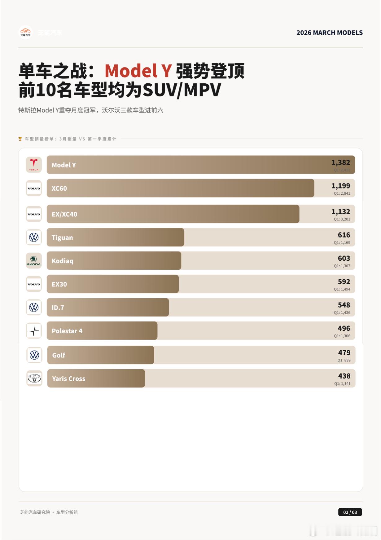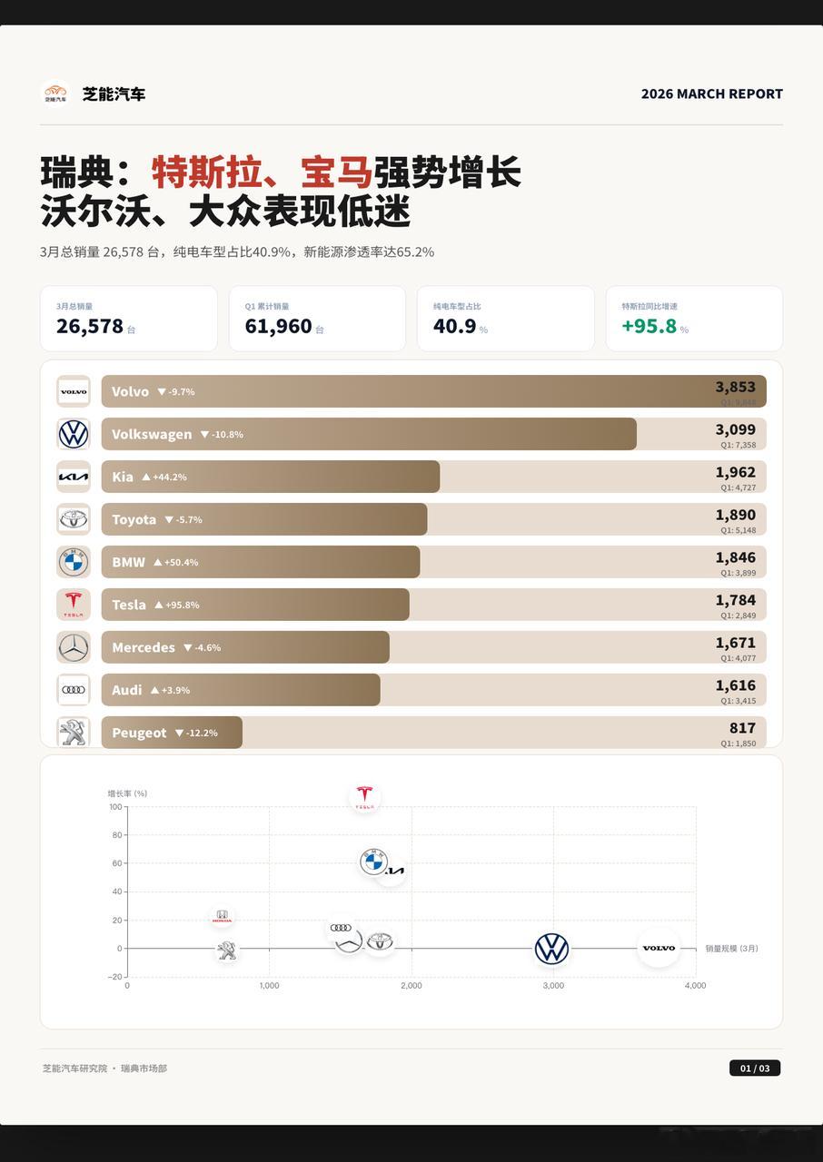 2026 年 3 月瑞典车市稳步增长,新能源车渗透率超六成,纯电份额持续提升。传统车企沃尔沃、大众销量下滑,转型压力明显,特斯拉强势反弹,宝马、起亚增速亮眼。