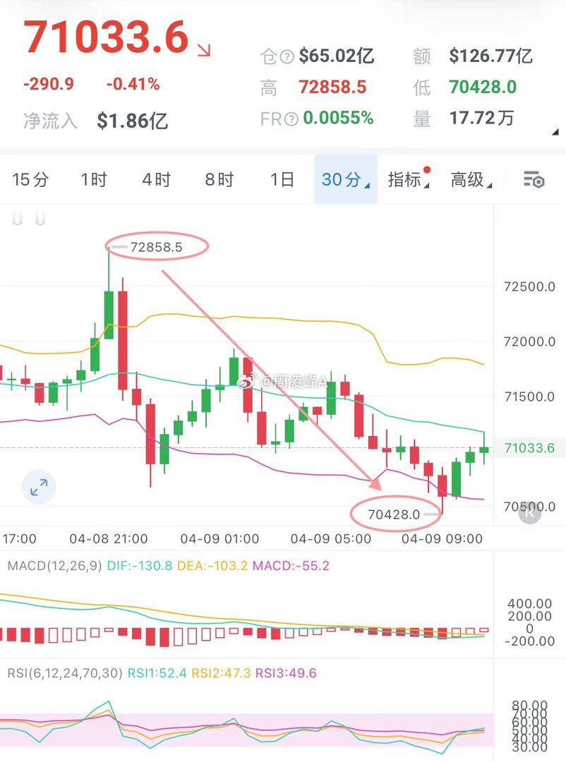 昨日文中提醒过急涨之后伴随着回调,比特币昨日回调至70400附近,2400点的空间在我的实磐都已兑现!(仪态同步)