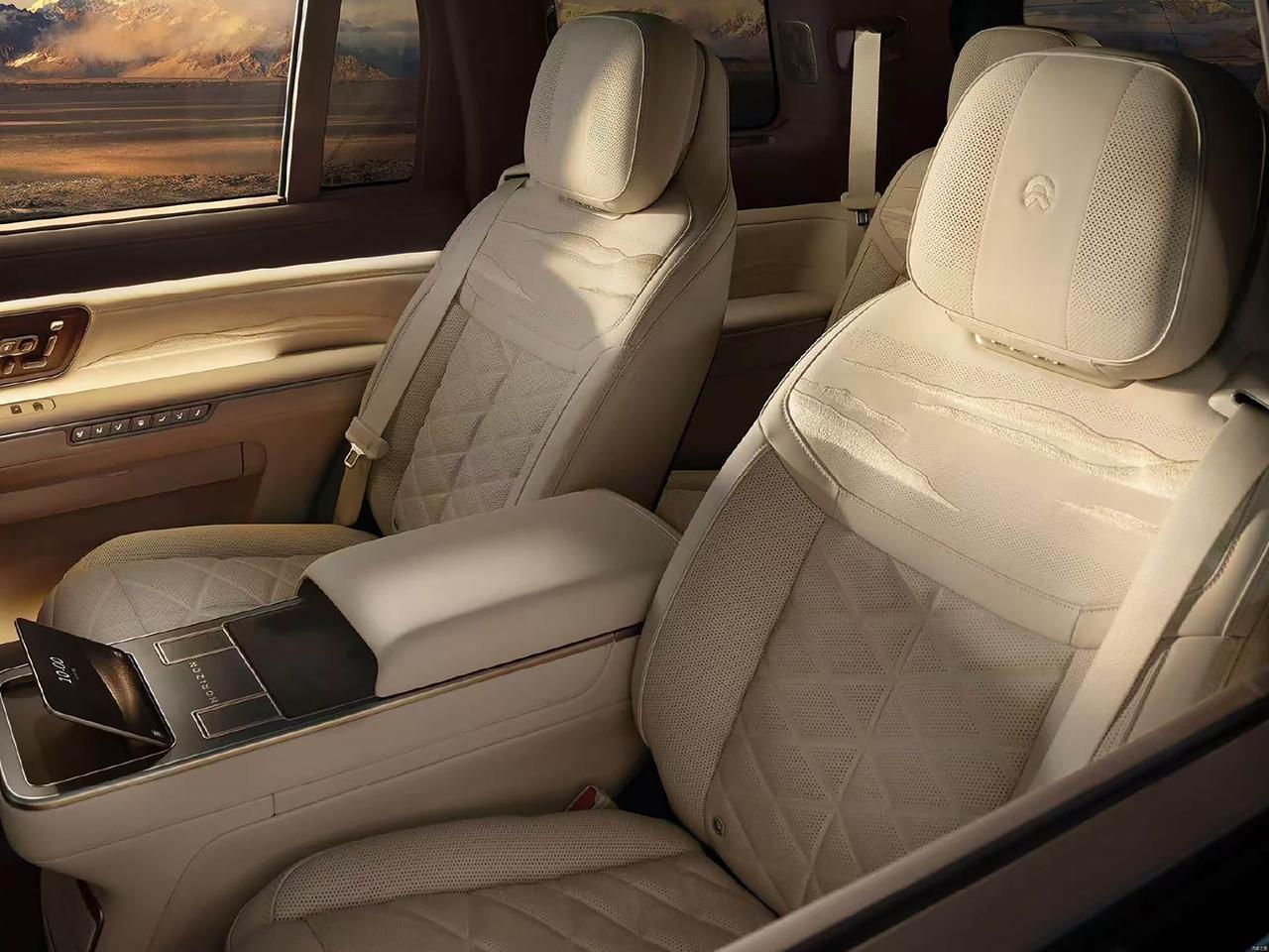 2、第三排进出的问题。首先,ES9是有带中央通道的六座版车型的,如果你的第三排经常坐人,就选这个版本,价格大概率还会低一点。其次,这次亮相的,ES9第二排带中央岛台的版本,二排座椅外侧会有一个「一键向前翻折」的按键,翻折和前移的速度很快,且归位后会自动给第三排留出空间。