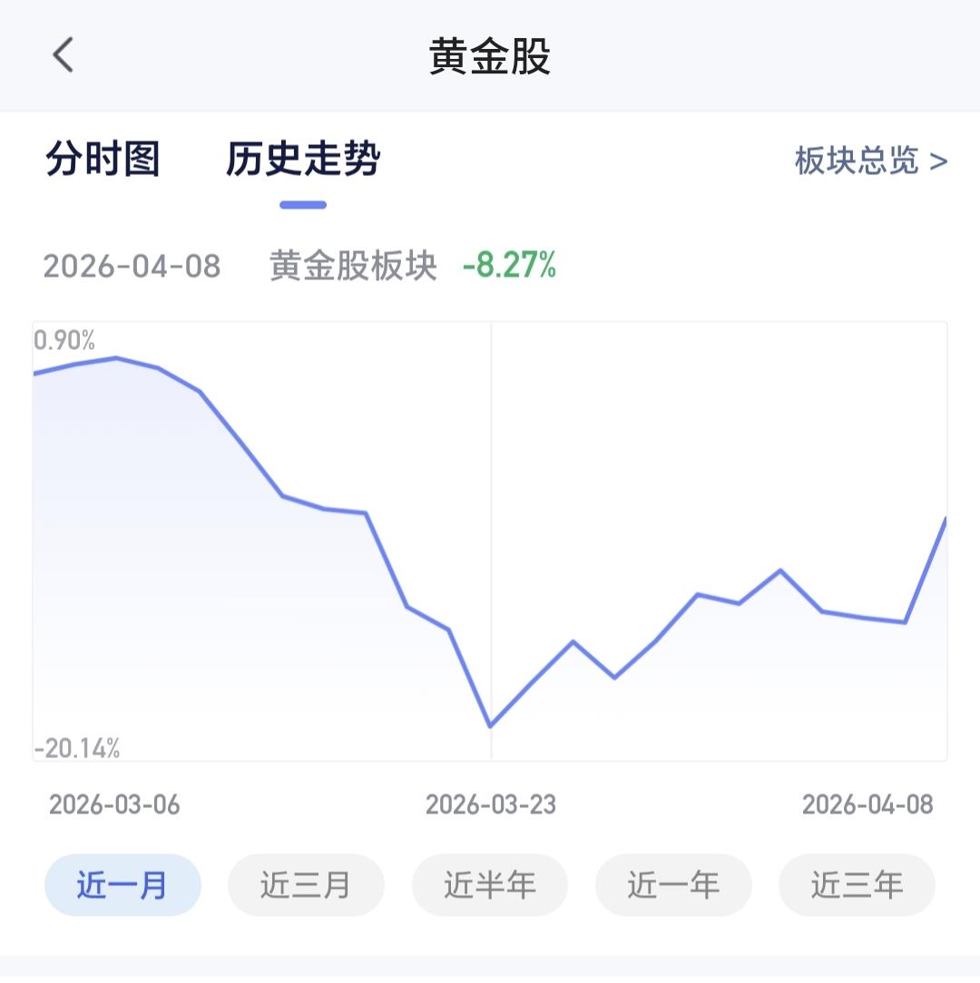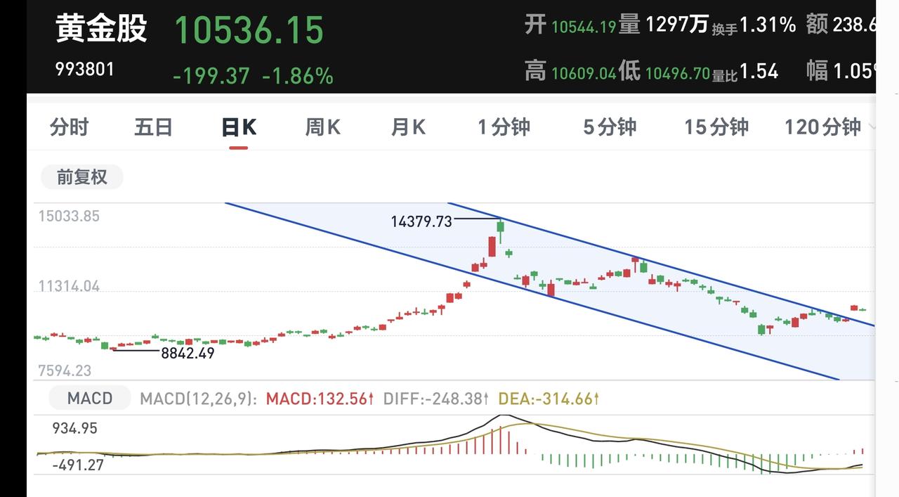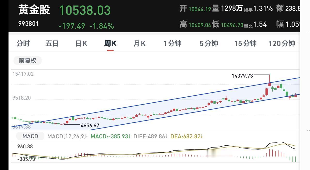 黄金股板块前几周下跌跌破了周线级别上涨通道的下轨线,昨天上涨回到了这个上涨通道内,今天在这个上涨通道下轨线附近震荡,如果能够重新回到这个上涨通道内,长线持有的人可以继续持有。