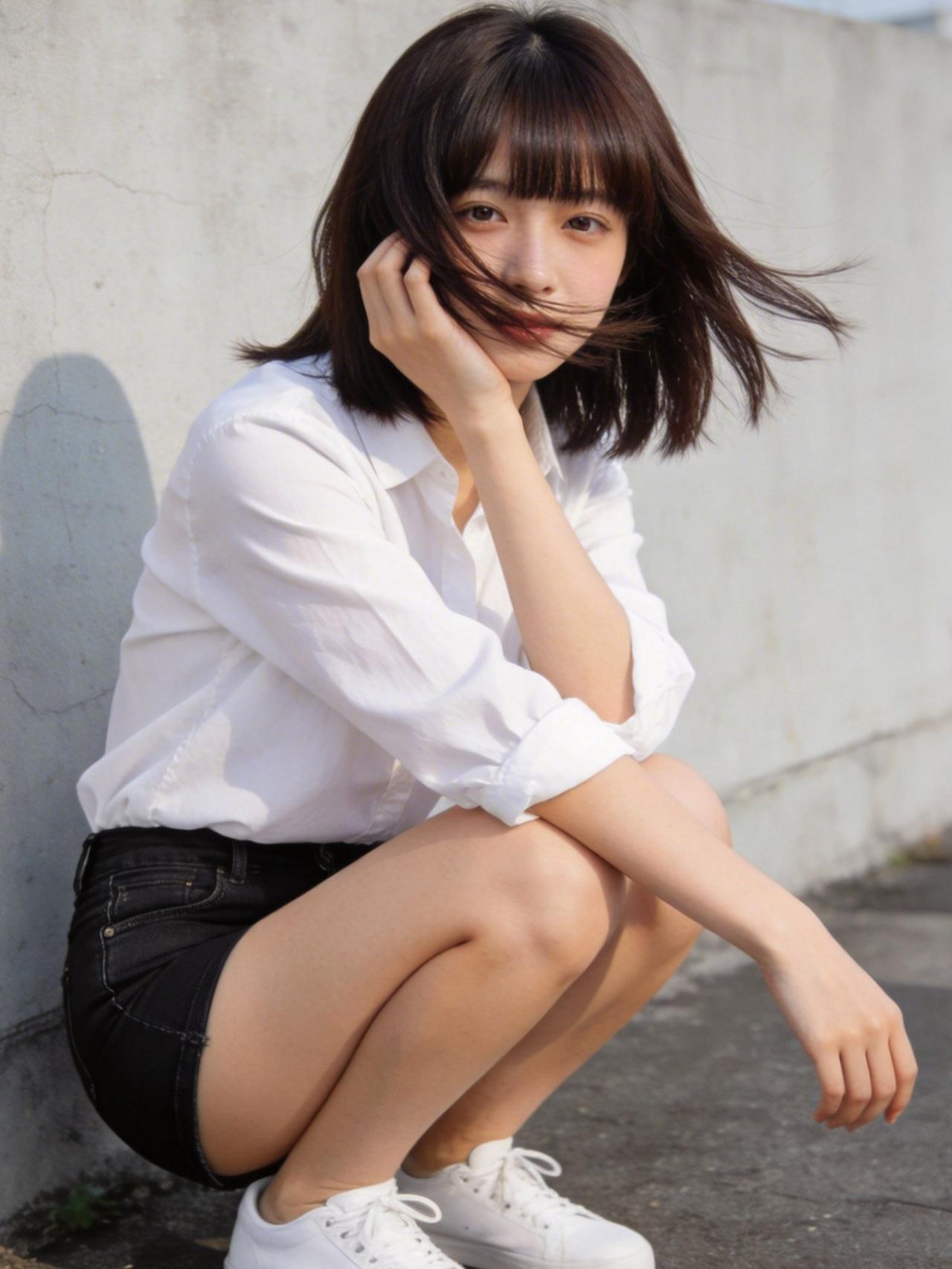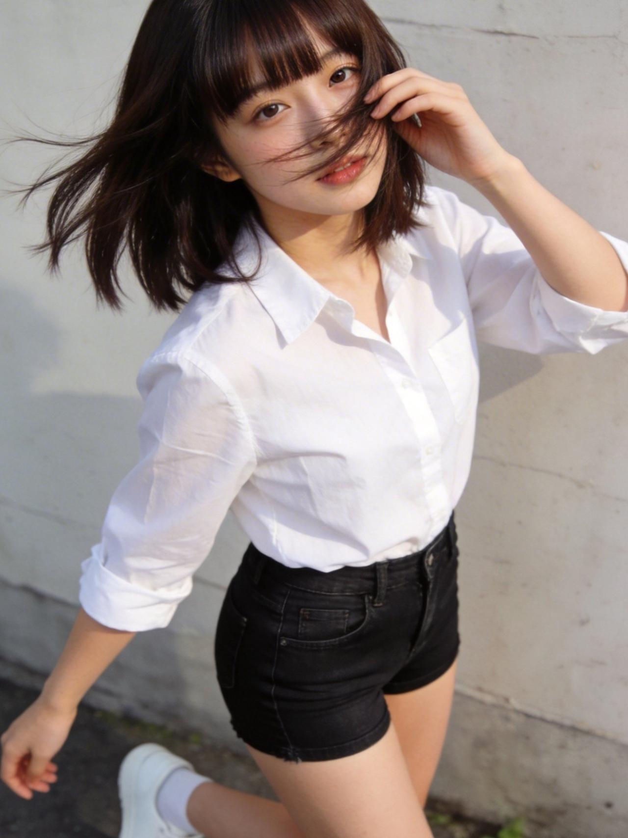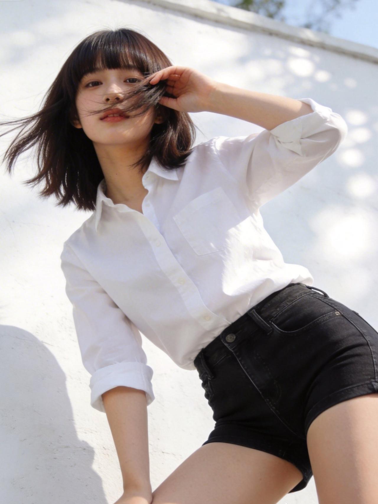 阳光倾洒,少女立于光影中,微风轻拂,发梢扬起细碎弧度。白衬衫干净素雅,领口微敞,露出纤细脖颈,袖口随意挽起,透着随性自在。黑牛仔短裤利落剪裁,勾勒修长腿部线条,与白衬衫形成经典黑白配,简约中藏着青春张力。她眉眼带笑,周身弥漫着蓬勃朝气,恰似夏日里最清新的风,满是青春洋溢的气息,让人移不开眼。牛仔短裤配什么鞋子好看 清透白衬衫写真 校园少女风衬衫