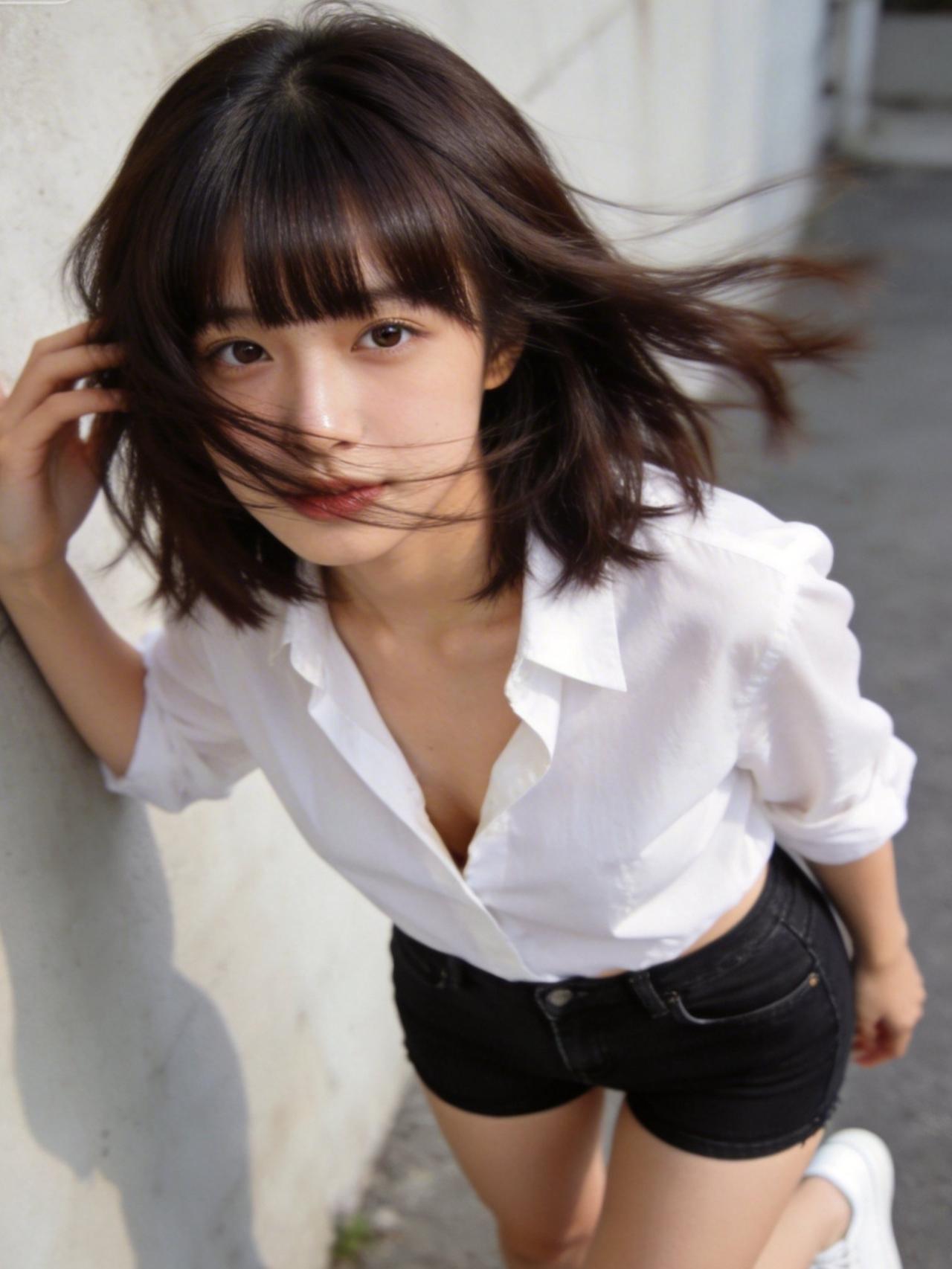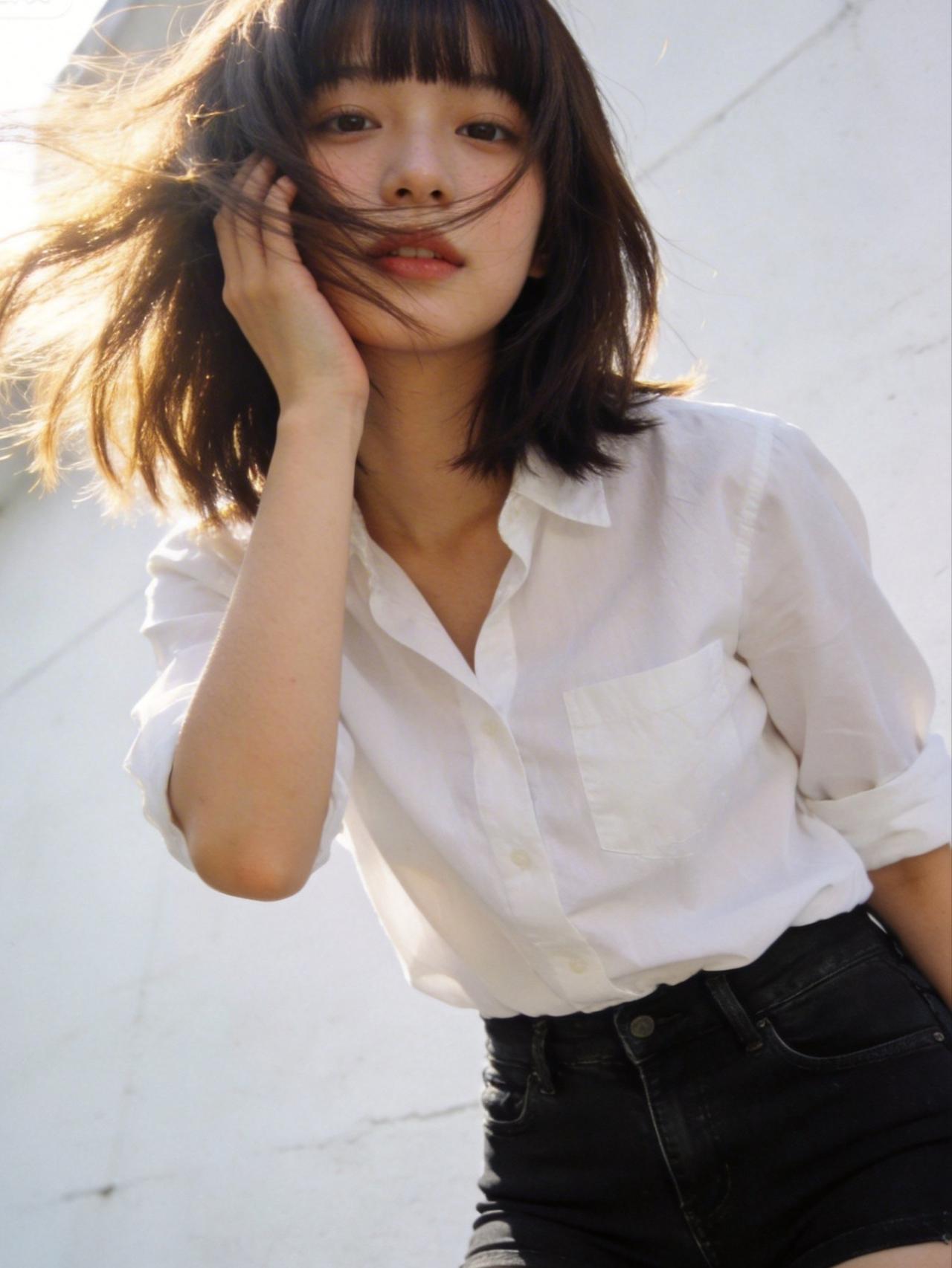 阳光倾洒,少女立于光影中,微风轻拂,发梢扬起细碎弧度。白衬衫干净素雅,领口微敞,
