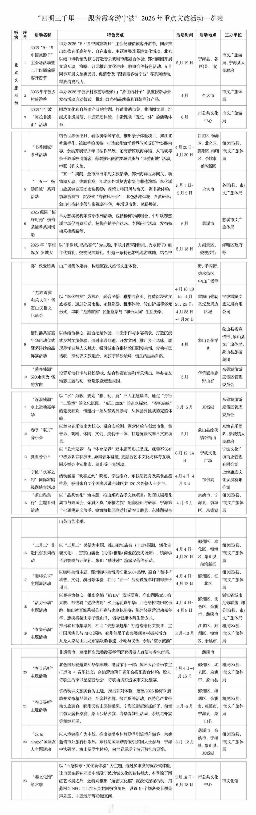 千万消费券和特色活动激活宁波春日经济 4月至6月,宁波推出“四明三千里——跟着霞客游宁波”系列文旅活动,围绕乡村、文体、研学、美食四大板块,举办百余项重点活动,同步派发千万级文旅消费券与10万份出行打车券包,激活春日消费。