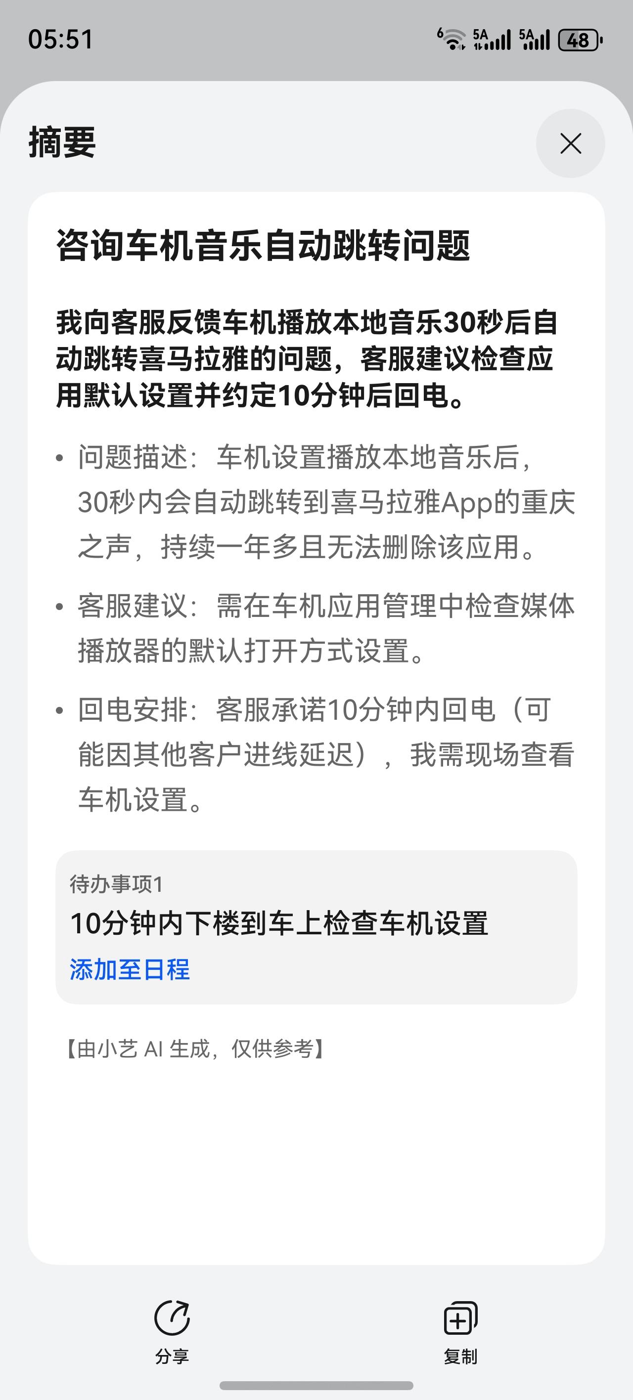 我的车从前年就出现一个问题,就是车机启动后自动播放本地音乐时,总是跳转喜马拉雅的问题,让4S店处理,他们解决不了,忍了一年多,只有打客服解决,结果比亚迪回复说是喜马拉雅版本的问题,既然是版本的问题,发现这个BUG了,你倒是修复升级啊?怎么能说让我再等一会儿?一会儿是多久?一两个小时?一两天?一两年?还是多久?