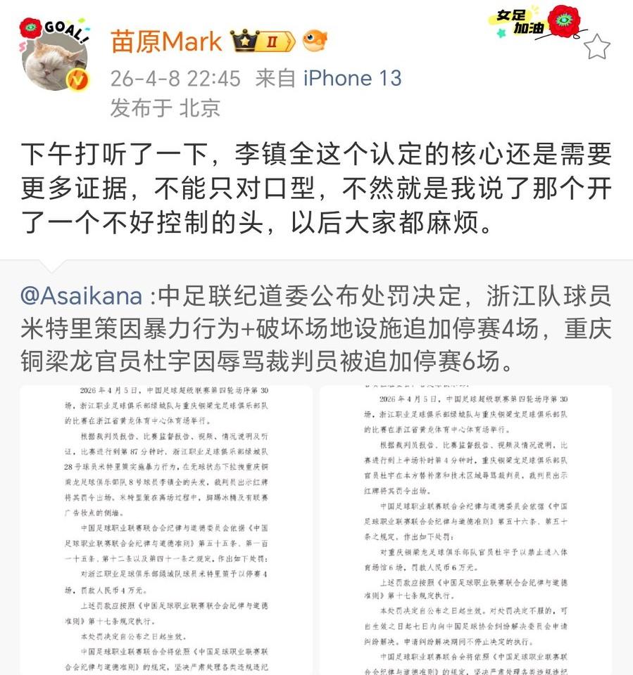 这个要看证据能否卡上规则,说实话中足联的昨天放出风来,很多媒体人和球迷对出发李镇全都不太同意,因为大家觉得赛场上飙脏话,是很正常不过了,如果这要处罚,以后踢比赛,球员都得谨言慎行了。最后中足联没有处罚李镇全,只处罚了米特里策和重庆铜梁龙的助教。而浙江第一时间也对米特里策进行了内部处罚,算是表明了态度。现在提出对李镇全处罚,也算是表明态度,看中足联如何处理。如果这次处罚了,以后这样的事中足联会很被动。如果不处罚,可能会带来一些不好的风气。