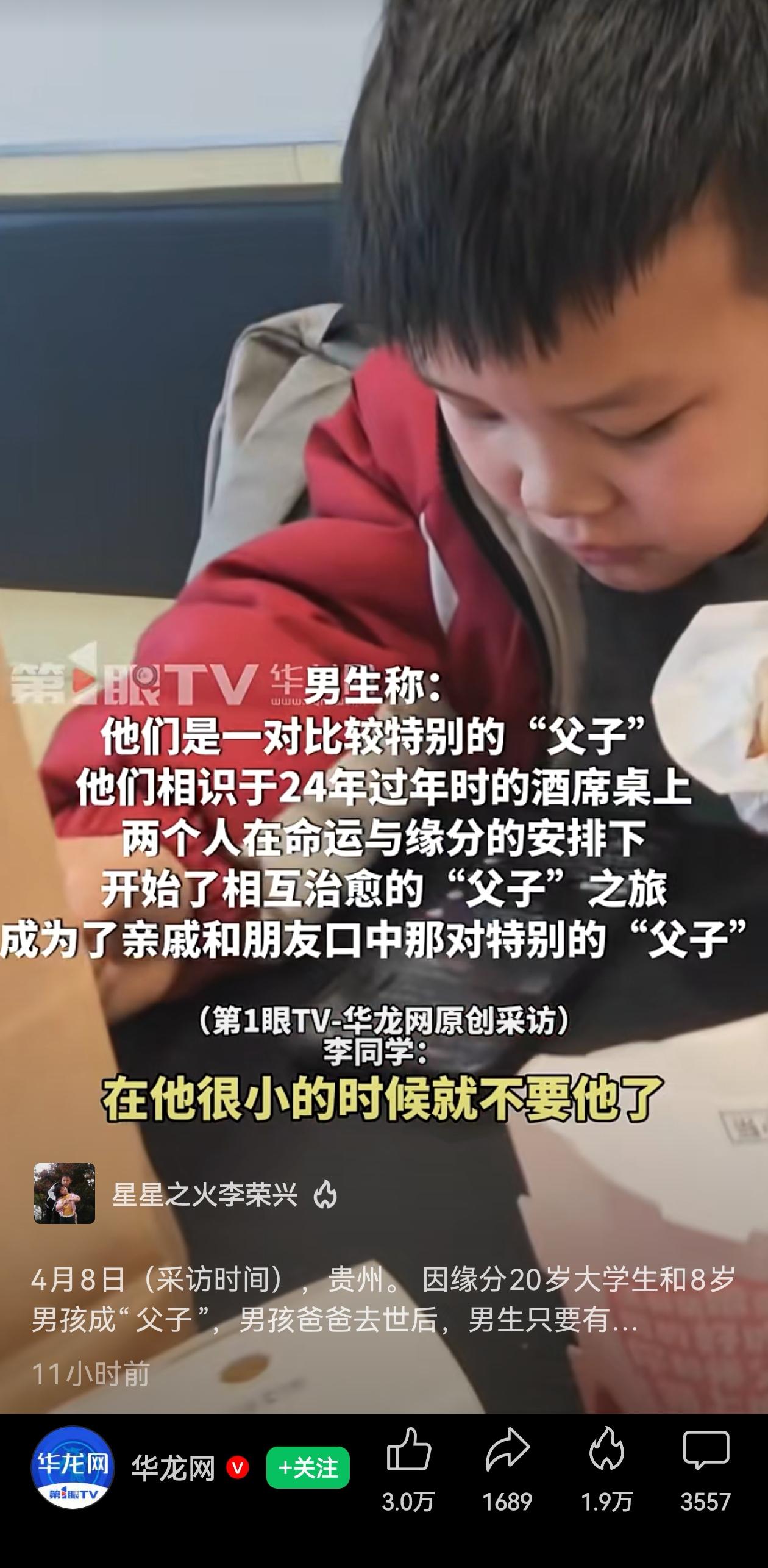 20岁的大学生,应该忙得很,打游戏、谈恋爱……可贵州这个小伙子,却主动扛起了一份本不属于他的责任:在假期陪伴、教导、爱他……用自己父亲爱自己的方式引导小男孩。