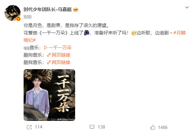 马嘉祺新歌一千一万朵正式上线 马嘉祺新歌一千一万朵正式上线 “你一定等着我,我捧着花去找你了”终于等来这首歌的完整版了,马嘉祺唱歌就是一个大写的夯呀!