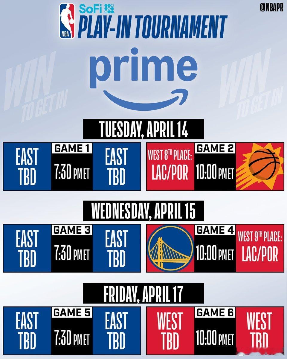附加赛赛程官宣:4月15日G1 | 7:30 东部第八vs东部第七G2 | 10:00 西部第八(快船/开拓者)vs太阳4月16日G3 | 7:30 东部第十vs东部第九G4 | 10:00 勇士vs西部第九(快船/开拓者)nba附加赛金州勇士热火