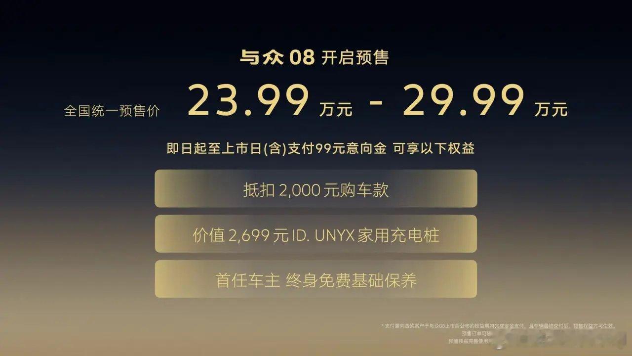 与众08全新以赴 预售23.99万起“金标大众全新一代车型首款产品——与众08开启预售了,预售价23.99 - 29.99万元, 这也是我期待已久的一款车,我已经试过了与众08,副驾12向电动调节零重力座椅,带通风、按摩功能,后排座椅电动调节与加热,座椅放倒纯平。有智能冷暖冰箱、1.74㎡光感天幕、20扬声器HiFi音响系统。基于800伏高压碳化硅平台,5分钟快充补能150公里,CLTC续航最高730公里;双腔空气悬架、AI智能底盘,新增防晕车模式。它在威巴克双腔空簧加持下的动态表现着实令人惊艳,德味十足。 正在考虑入手 …… 与众08才是德系电车该有的质感