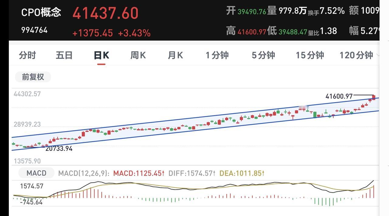 Cpo板块今天大涨,现在盘中上涨突破了日线级别上涨通道的上轨线,进入了加速上涨走势,这样的情况下,持有的人可以继续持有,但不建议追涨进场。