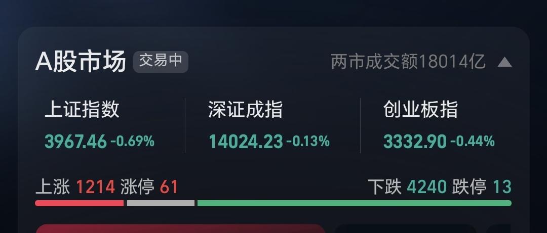 市场上涨1214家,下跌4240家,上涨家数少于下跌家数,涨停61家,跌停13家。