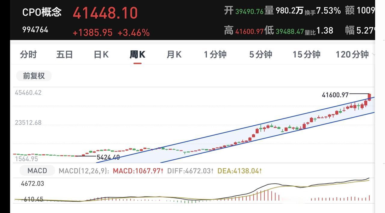 CPO板块今天上涨也突破了周线级别上涨通道的上轨线,说明也是进入了加速上涨走势,长线持有的人可以继续持有,但也不建议追涨进场。