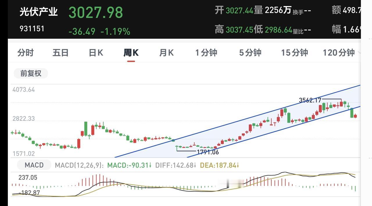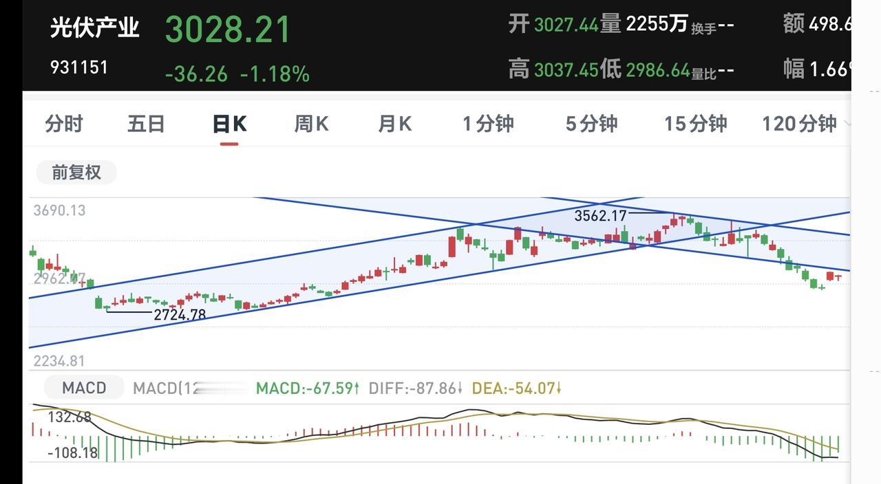 光伏板块前段时间下跌跌破了日线级别下跌通道的下轨线,昨天的上涨并没有能够回到这个下跌通道内,现在还是处于日线级别下跌趋势中,短线持有的人需要继续注意风险。