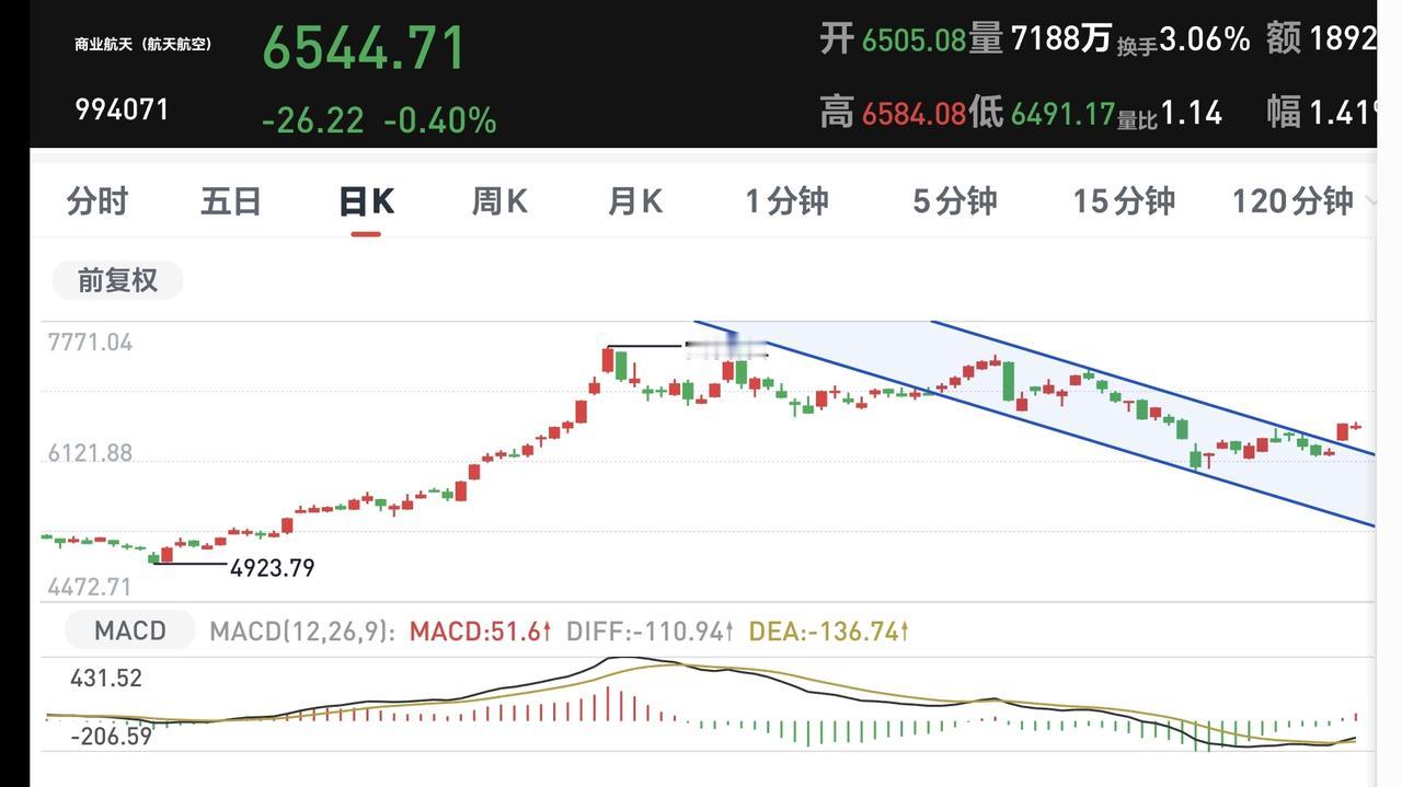商业航天板块昨天上涨突破了日线级别下跌通道的上轨线,今天是在这个上轨线上方震荡,注意观察这个突破是不是有效突破,如果是有效突破,短线持有的人可以考虑要不要进场。