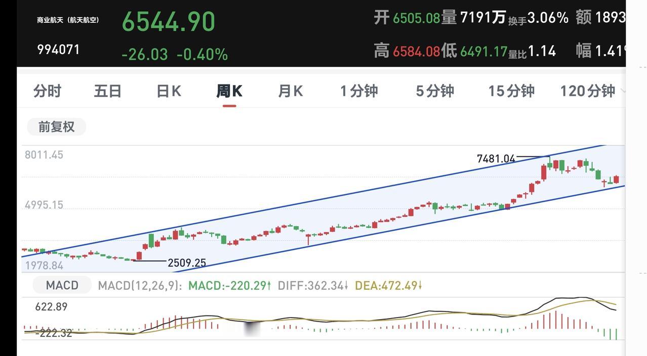 商业航天板块周线级别处于上涨通道中,最近一段时间的就是在这个上涨通道下轨线上方震荡,周线级别上涨通道的下轨线是长线持有者的持有条件,只要不跌破这条下轨线,长线持有的人都可以继续持有。