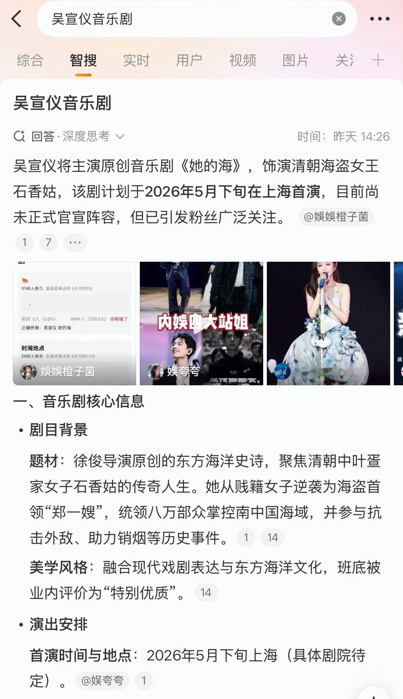 吴宣仪音乐剧她的海曝吴宣仪音乐剧五月首演 吴宣仪转型ing,网传音乐剧即将首演~吴宣仪也演过好几部剧了,能去线下的舞台锻炼演技还挺好的~曝吴宣仪要转型