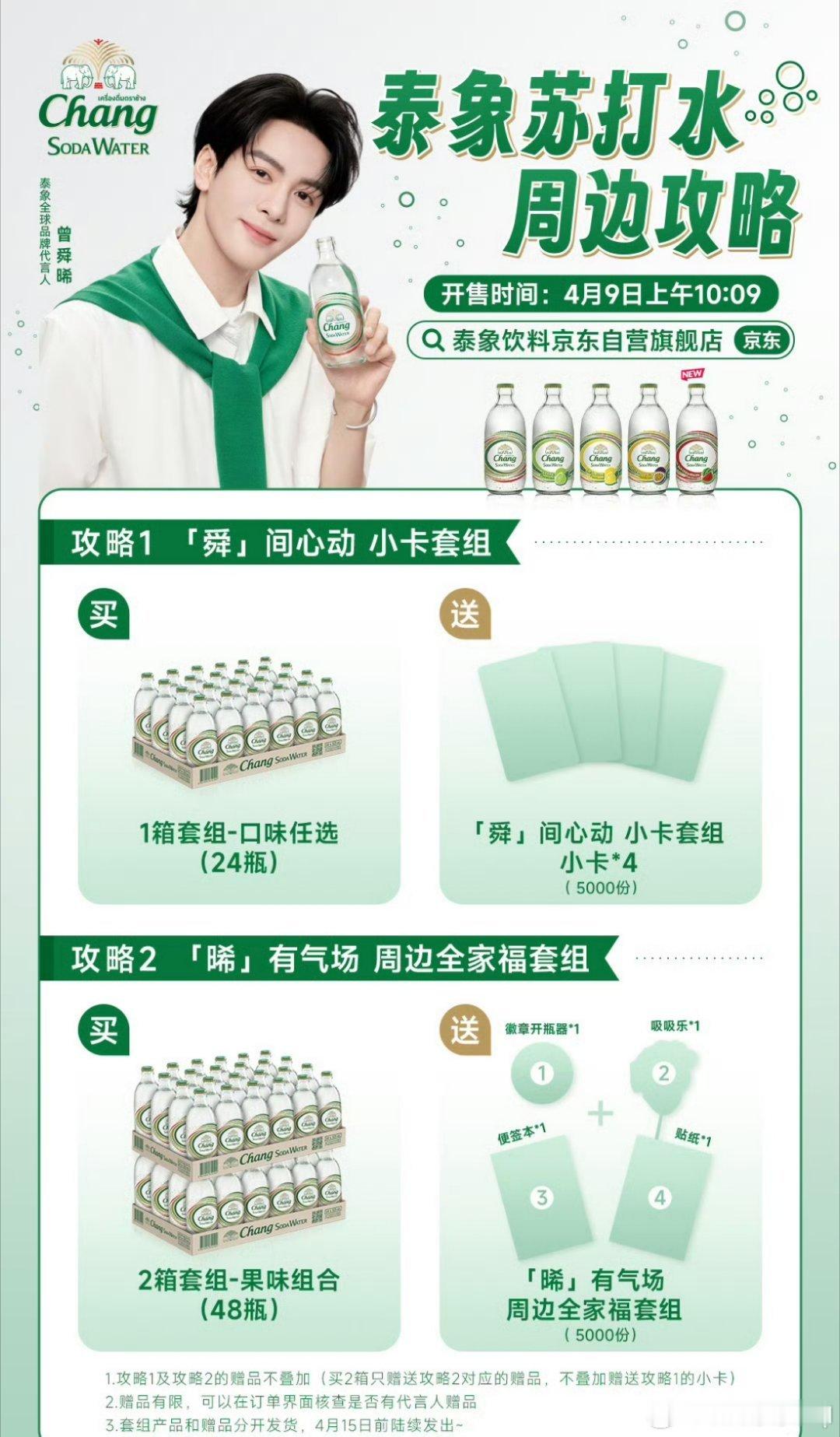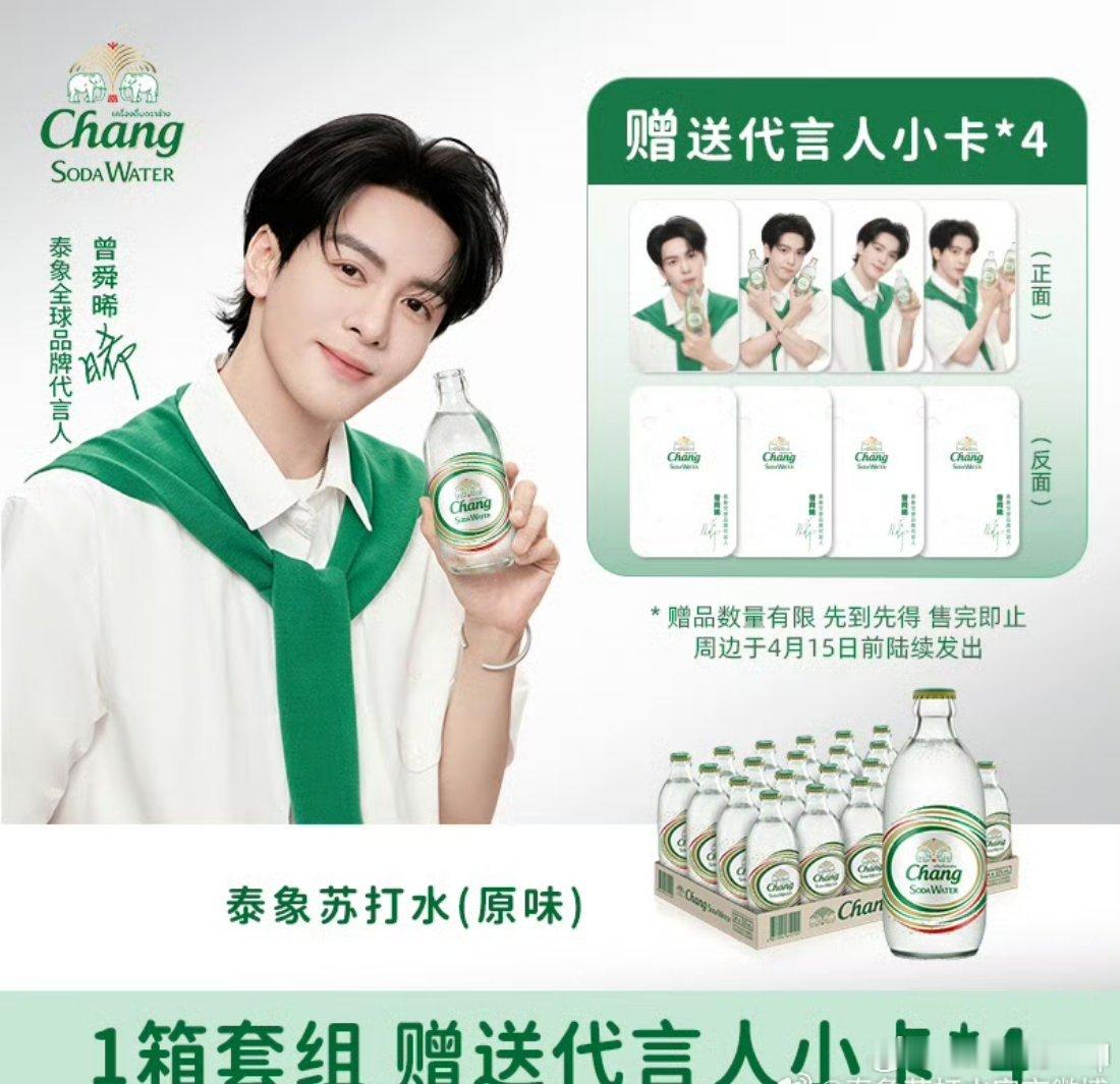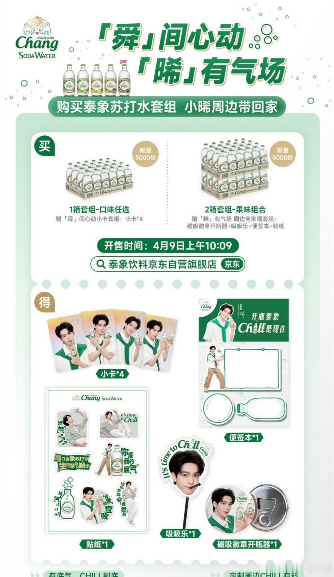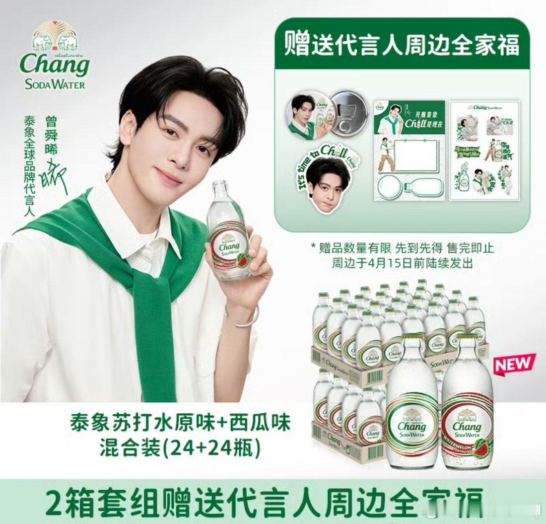一起给曾舜晞打Chill开瓶泰象Chill是现在泰象苏打水品牌联动代言人曾舜晞发起的限时营销活动,核心包含品牌限定周边抢购和粉丝创意应援两大主线,推出「舜间心动」套组:购买1箱(24瓶)任选口味,赠「小卡套组」*4(限量5000份);「晞有气场」套组,购买2箱(48瓶)果味组合,赠「周边全家福」含磁吸徽章开瓶器、吸吸乐、便签本及贴纸(限量5000份)。号召我们在4月9日共同参与。品牌以"底气满格,一起Chill等惊喜"为口号,既推广无糖苏打水的清爽定位,也借"Chill"传递曾舜晞与粉丝共享的松弛生活态度。你准备好了吗?