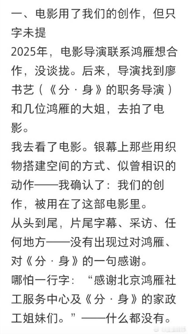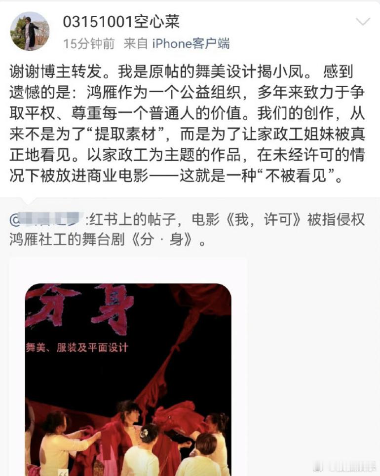 电影我许可回应侵权电影《我,许可》就影片“女工之家”片段引发的侵权争议做出回应,表示“在筹拍阶段,剧组接触了北与北京鸿雁社工服务中心接洽过程中,由于双方就合作方式未能达成一致,很遗憾未能合作。此后,剧组邀请了有相关创作经验的舞蹈艺术家、剧场导演廖书艺为影片创作剧场桥段”,还承诺后续将会在上线流媒体的版本中增加对相关公益组织的鸣谢。