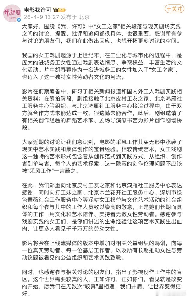 电影我许可回应侵权电影《我,许可》就影片“女工之家”片段引发的侵权争议做出回应,