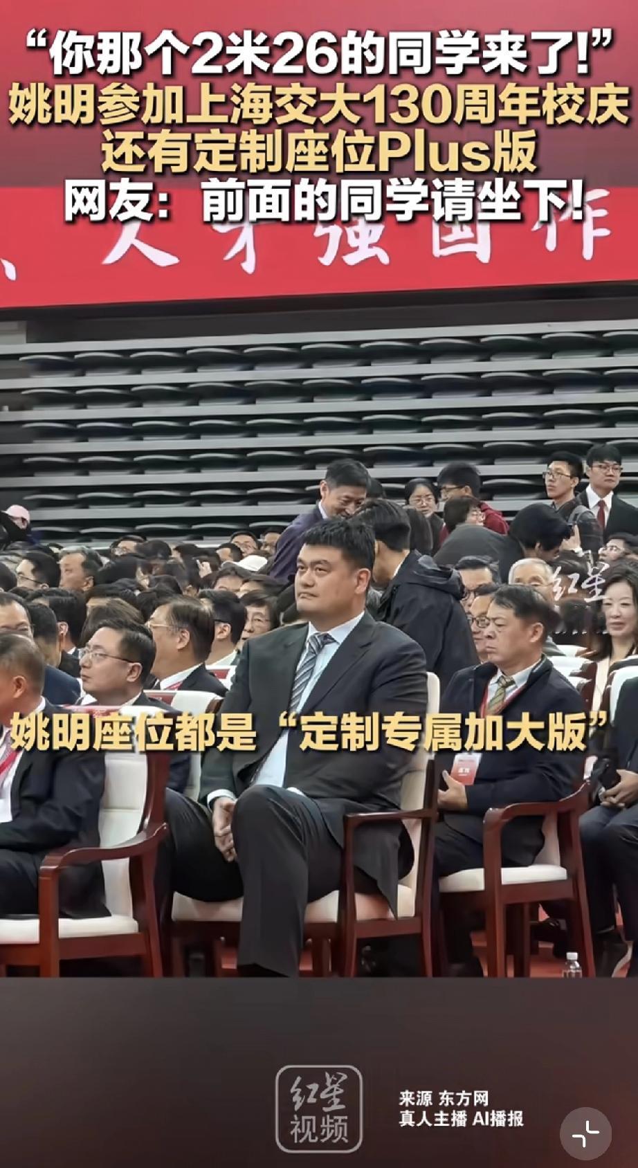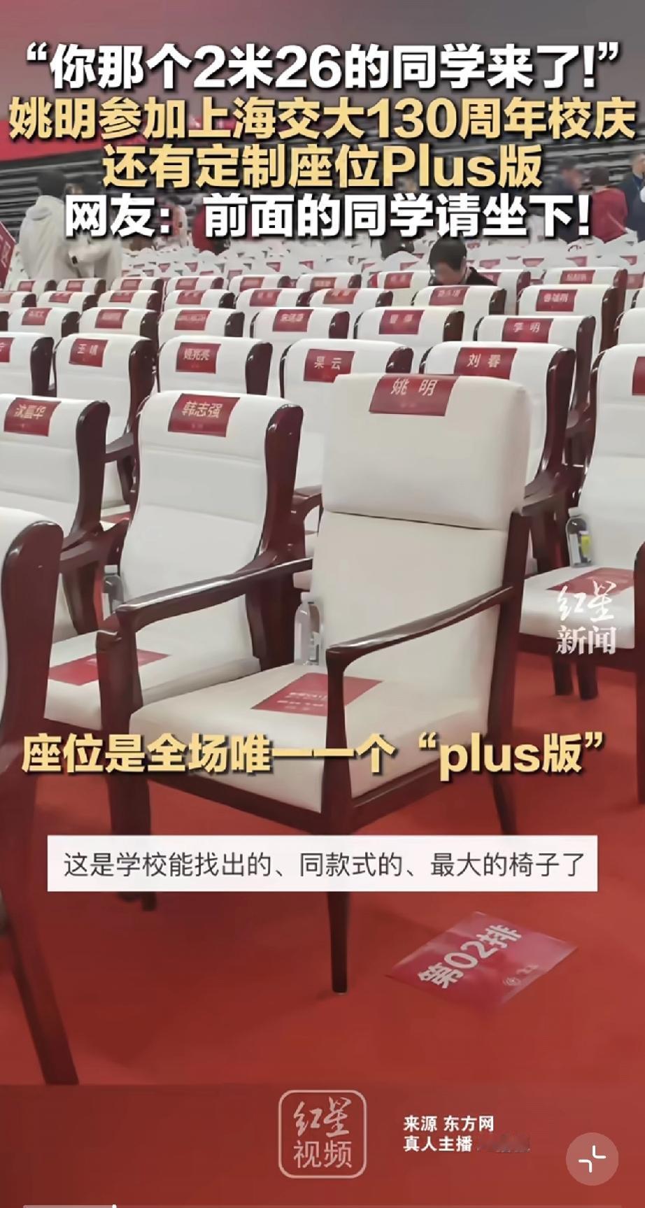 姚明个子高也发胖了体重大,如果没有特别版的座位,根本就没办法来参加活动,因此他的座位被称为唯一的一个plus版!