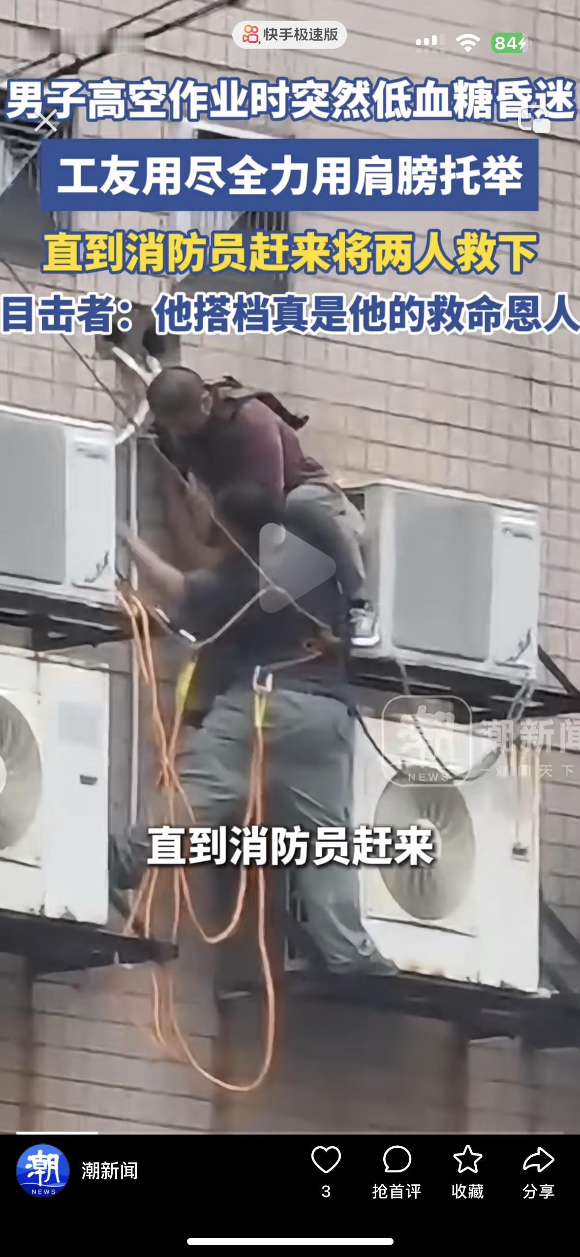 幸亏这位工友,不然男子的低血糖可能就要了命了。这样的救命之恩必须要好好感谢。