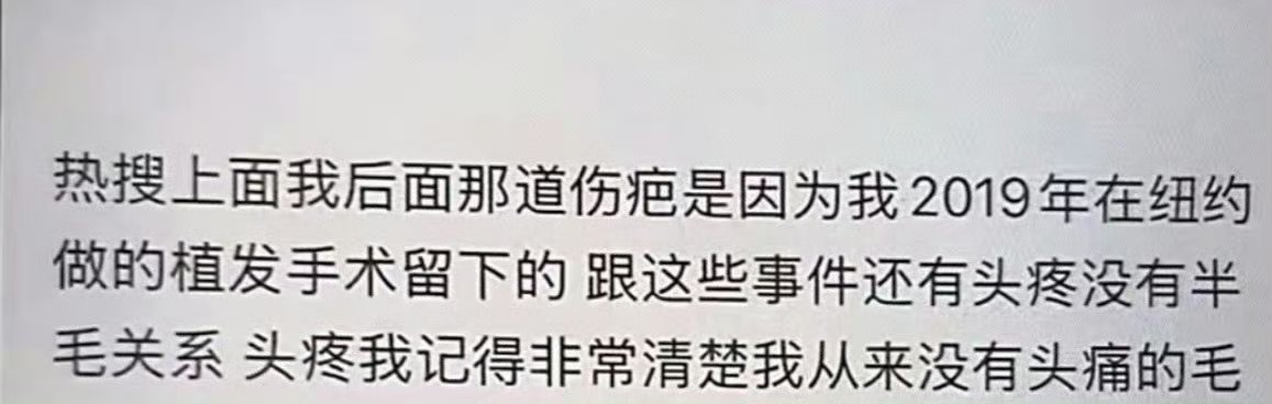 金子涵称后脑勺伤疤是植发手术留下的近日,金子涵在直播中就后脑勺疤痕作出澄清,明确其为2019年FUT植发手术的术后痕迹,与后续头痛事件无关。针对网络上的各类猜测,当事人已逐一厘清关联、驳斥不实联想。我们呼吁公众理性看待艺人相关事件,尊重医学常识,停止对疤痕的过度解读与阴谋化揣测,将目光更多投向艺人的身心健康与合法权益,共同守护清朗的网络环境。