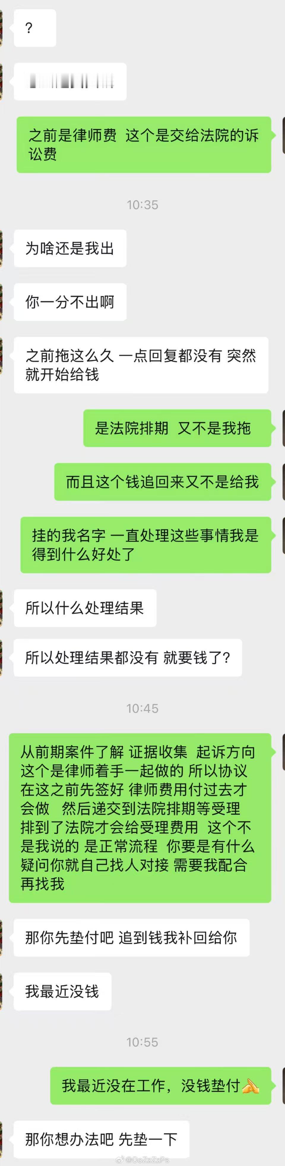 律师费是她出的想要和文中的“神秘人士”平摊诉讼费,结果对方说没有钱一分也不想出。