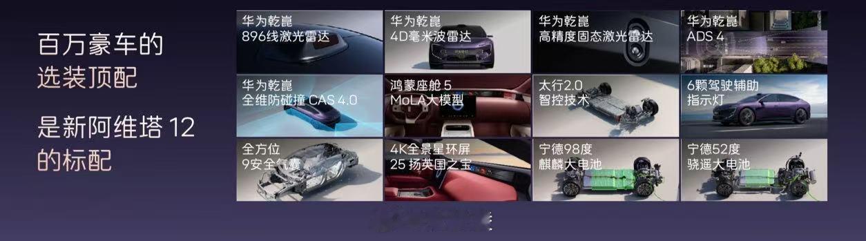 先看硬货。新阿维塔12全系标配12项原本百万豪车才有的选装:华为乾崑ADS 4.1、896线激光雷达、太行智控2.0、35.4英寸4K环屏、25扬英国之宝、9气囊……入门即满配。三电机版零百2.71秒,纯电续航735km,10分钟快充30%-80%。增程版纯电350km,综合1260km。