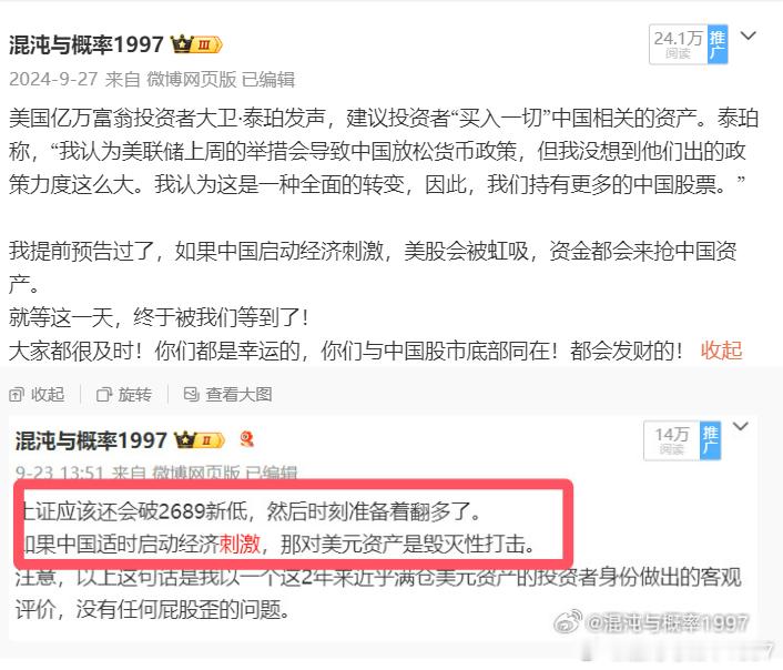 翻了一下,我抄底逃顶经常都是提前预告的,操作经常都是及时通知,从来没马后炮过。2024年9月23日提前预告中国如果启动经济刺激,对美元资产是毁灭性打击。第二天行情马上爆发,当时全网都在追捧美股,我是唯一一个敢喊出“清仓美股,买入a股”的人。