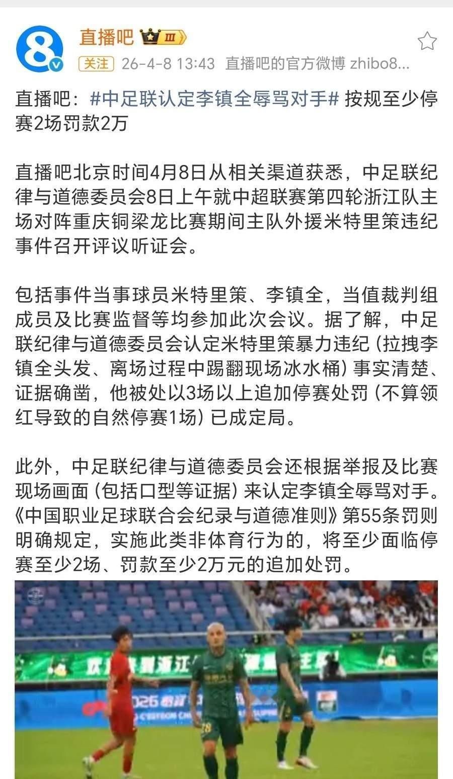 4月8日中午,直播吧发文称米特里策停赛3+1场,李镇全停赛2场,罚2万,稍后此文章被删除!