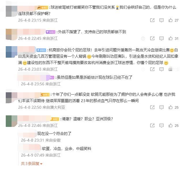 4月8—9日,浙江球迷纷纷在浙江队官博下表达不满,认为俱乐部应该保护好自己的球员,怒斥俱乐部!