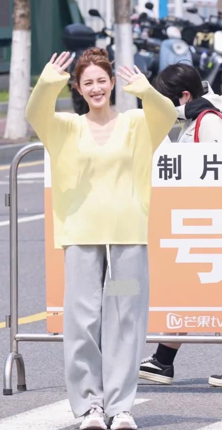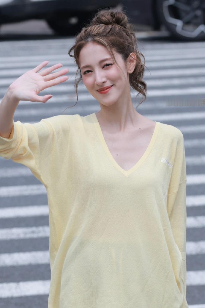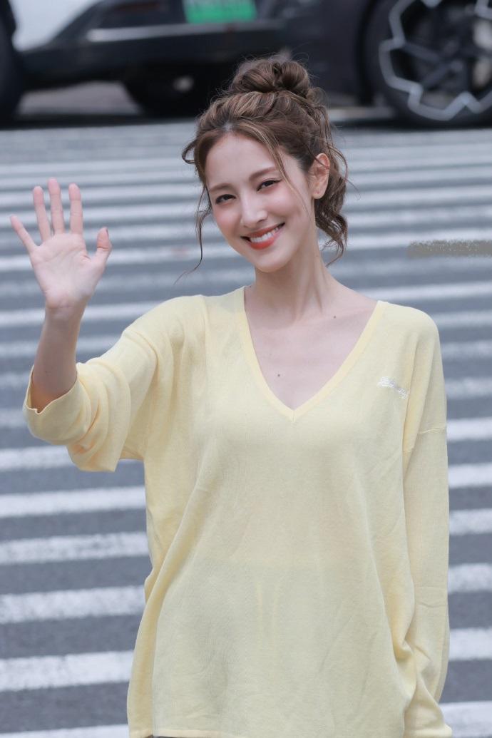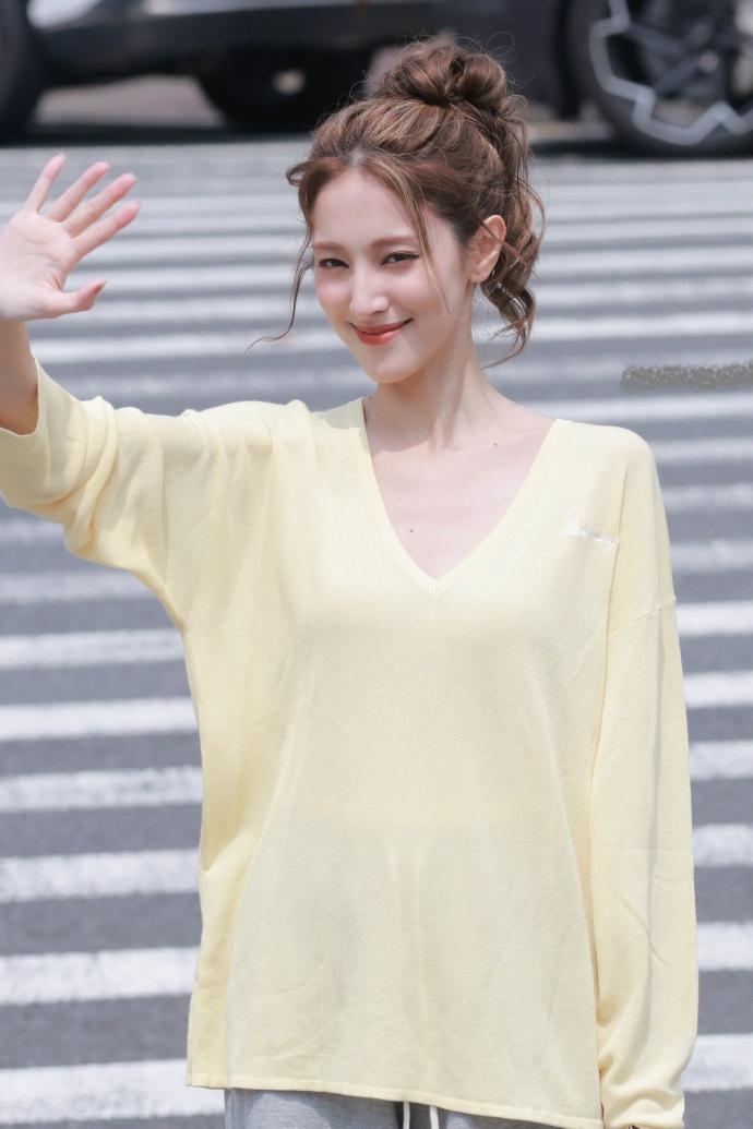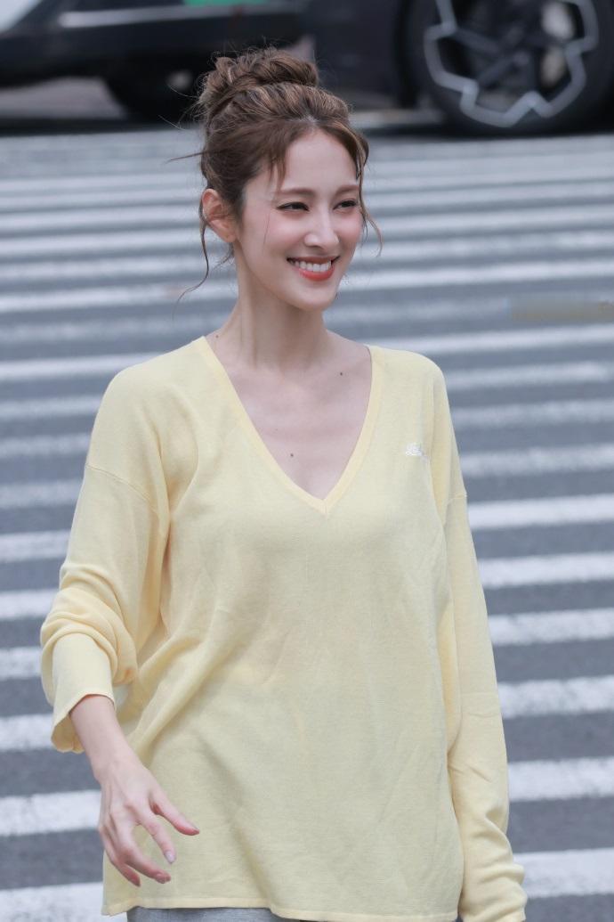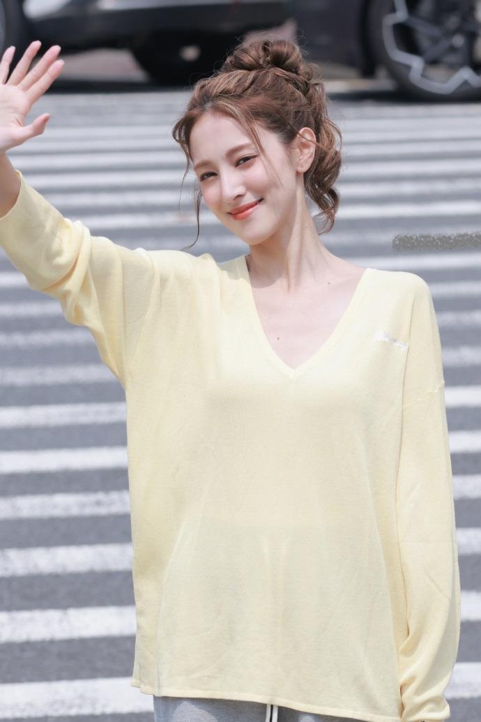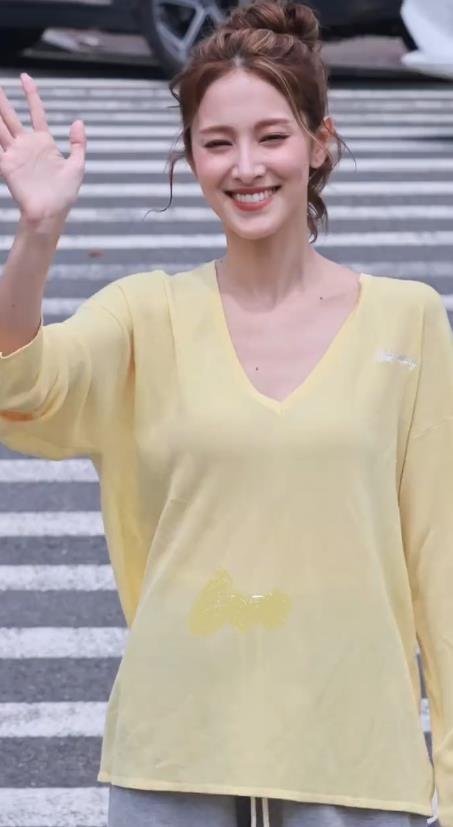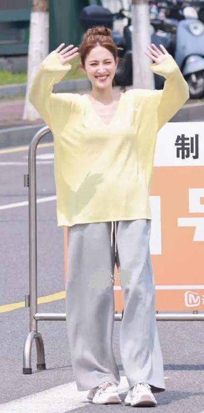 陈凯琳上身穿柠檬色V领衫,下身搭配灰色裤子,真的是太潇洒了。