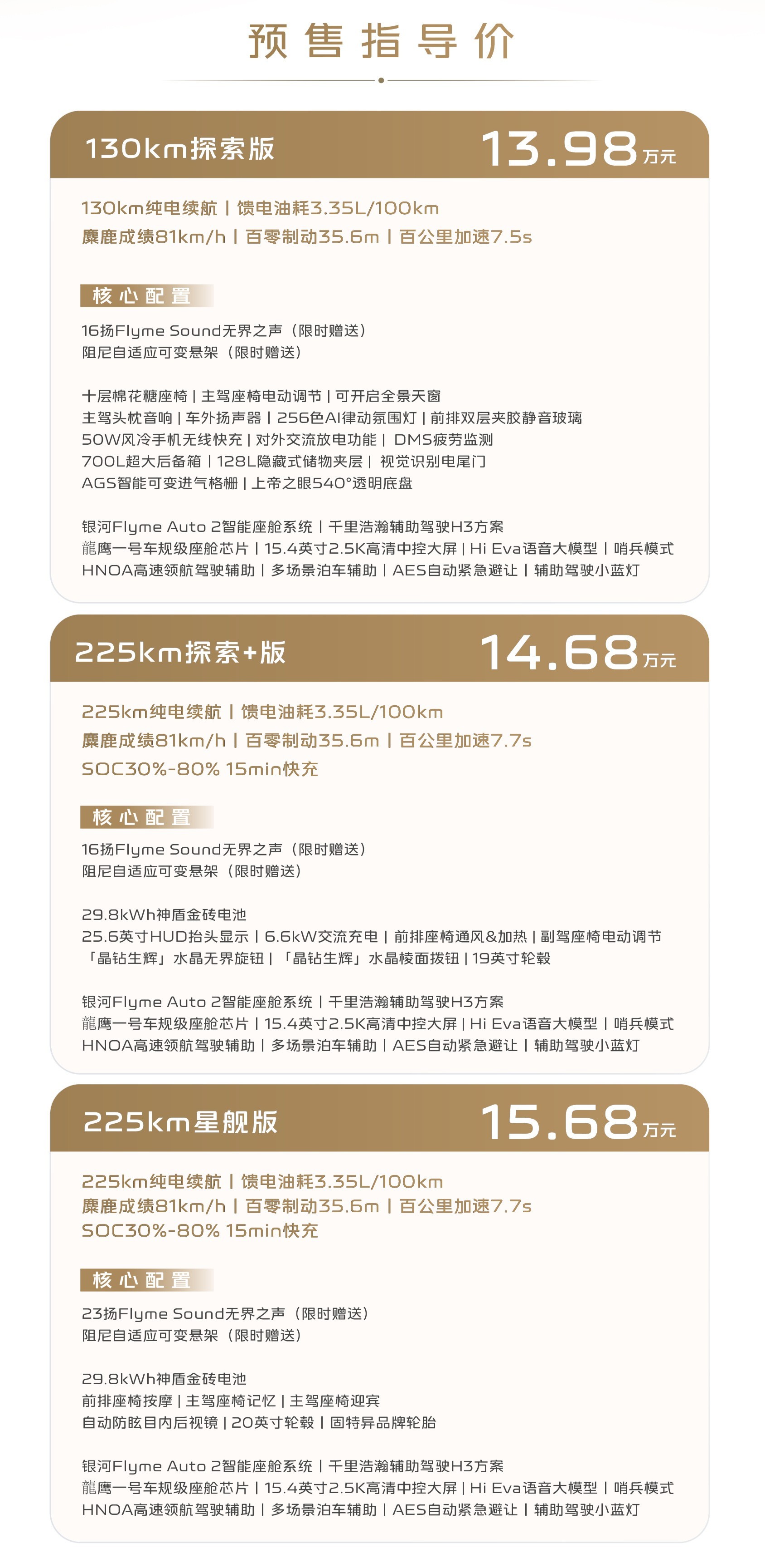 - 130KM 探索版:13.98 万元- 225KM 探索 + 版:14.68 万元- 225KM 星舰版:15.68 万元
