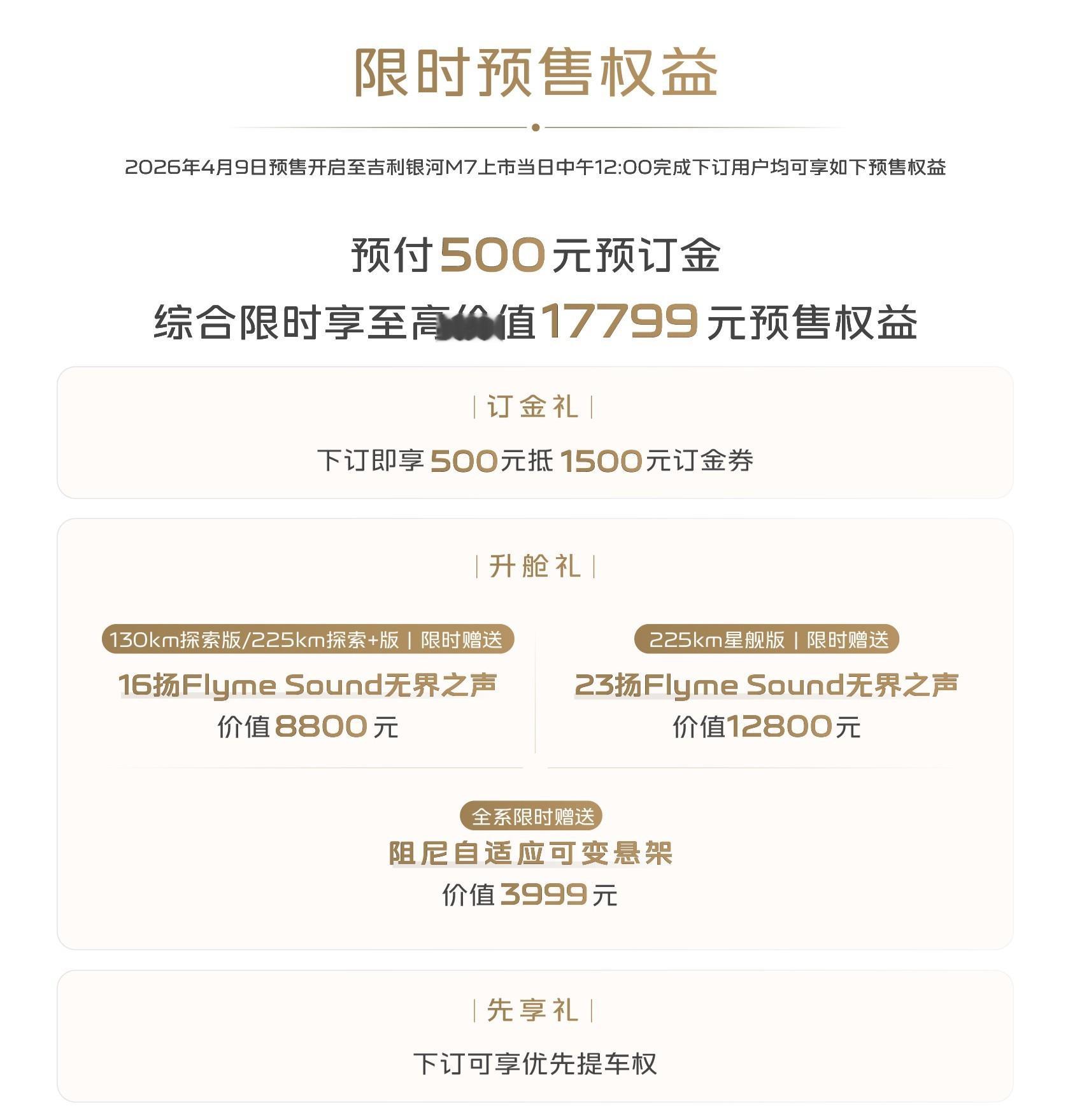 吉利银河 M7 共 3 款配置车型,预售价 13.98 万元起,全系限时赠送 3999 元阻尼自适应可变悬架