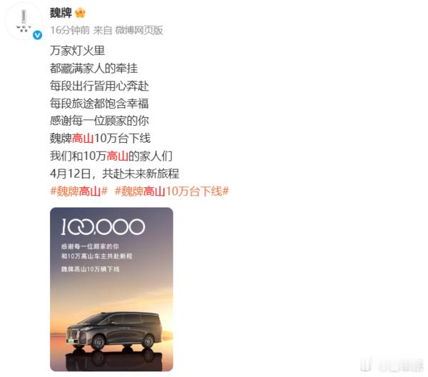 魏牌高山 10 万台下线 魏牌高山第 10 万台正式下线🎉2025.9-2026.1 连续 5 个月拿下新能源 MPV 销冠4 月 12 日将迎来家族新品 / 焕新高山 7/8/9 三款覆盖全场景全新高山 7 搭载 Hi4 性能版,零百 5.7 秒纯电续航最高 201km,综合续航 963km魏牌高山新能源 MPV