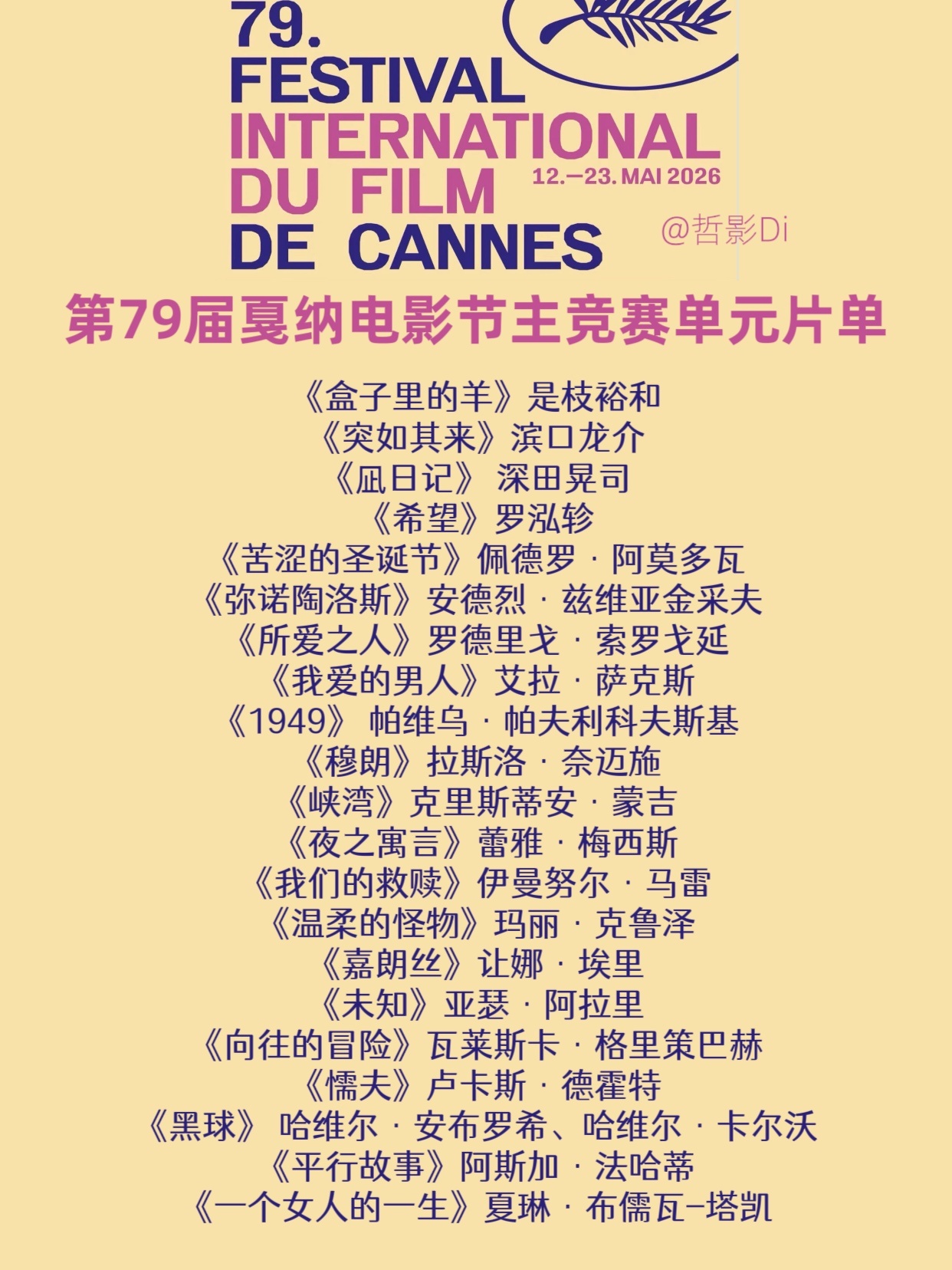 2026戛纳电影节片单第79届戛纳电影节主竞赛单元片单,是枝裕和、滨口龙介、阿莫多瓦、帕维乌、蒙吉、德霍特等导演新片共21部影片入围本届戛纳主竞赛单元。本届戛纳电影节将于5月12日-23日举行。以下为主竞赛单元片单↓ ↓ ↓