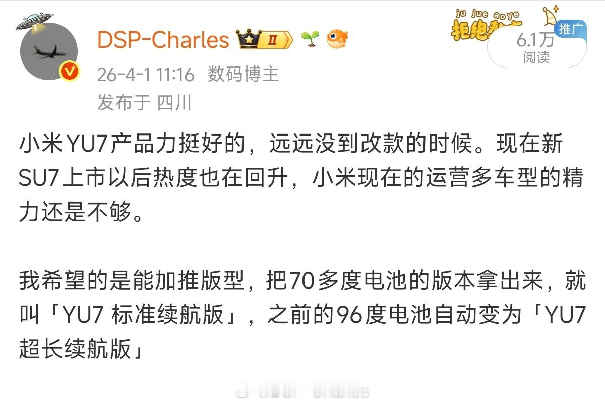 提前跟你们预告过,小米YU7还有电池略小的版本,进一步拉低入门门槛,整备质量下降