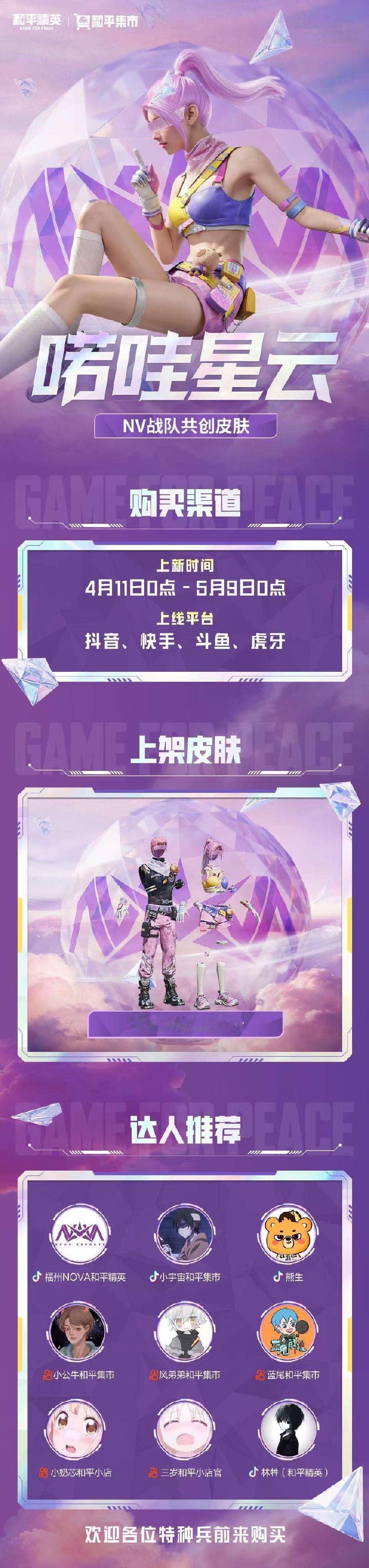 NV战队共创皮肤和平精英喏哇星云粉紫甜酷 × 机能潮酷,身法服自由搭配,和福州NV一起,驰骋星云战场
