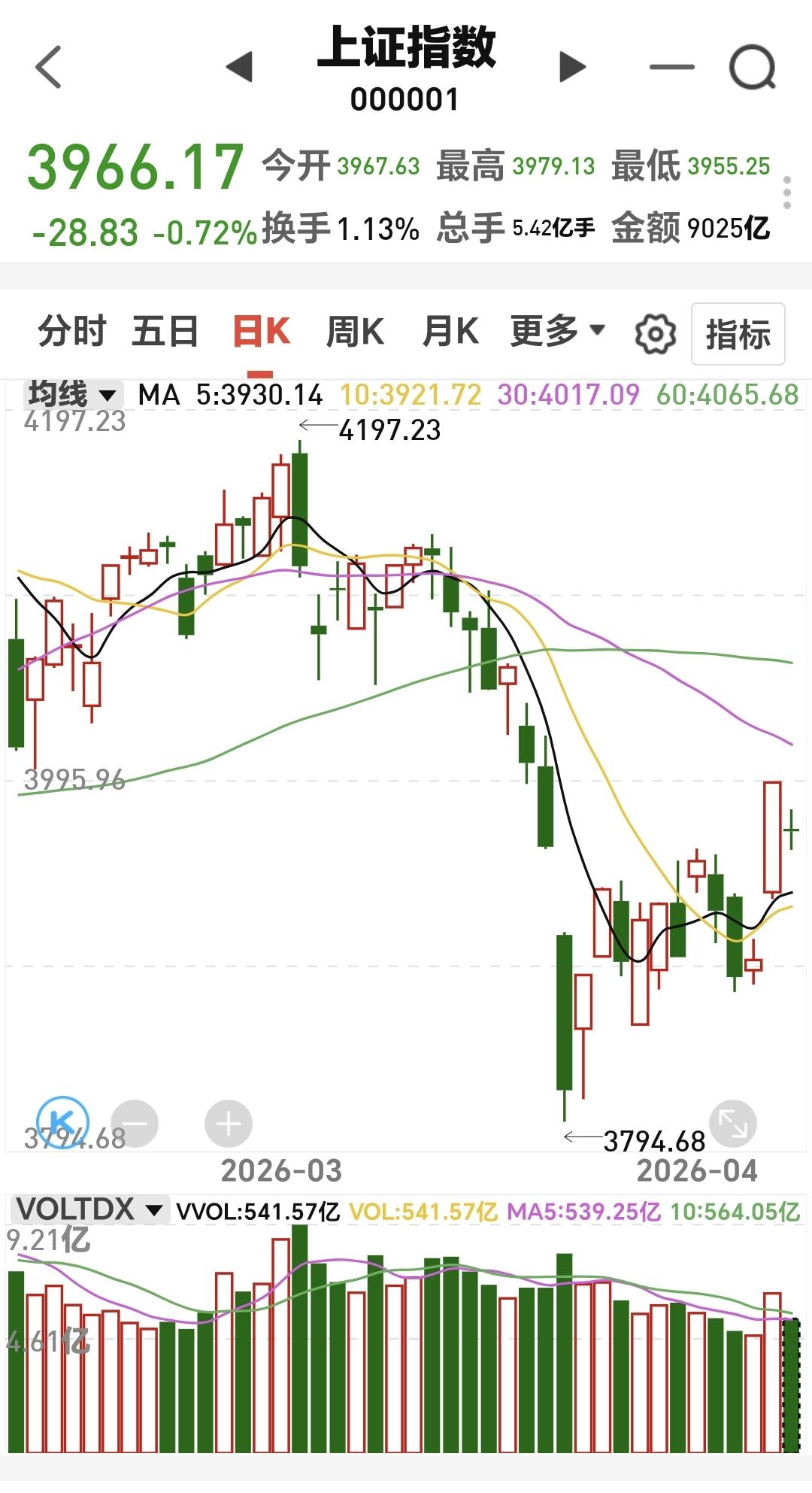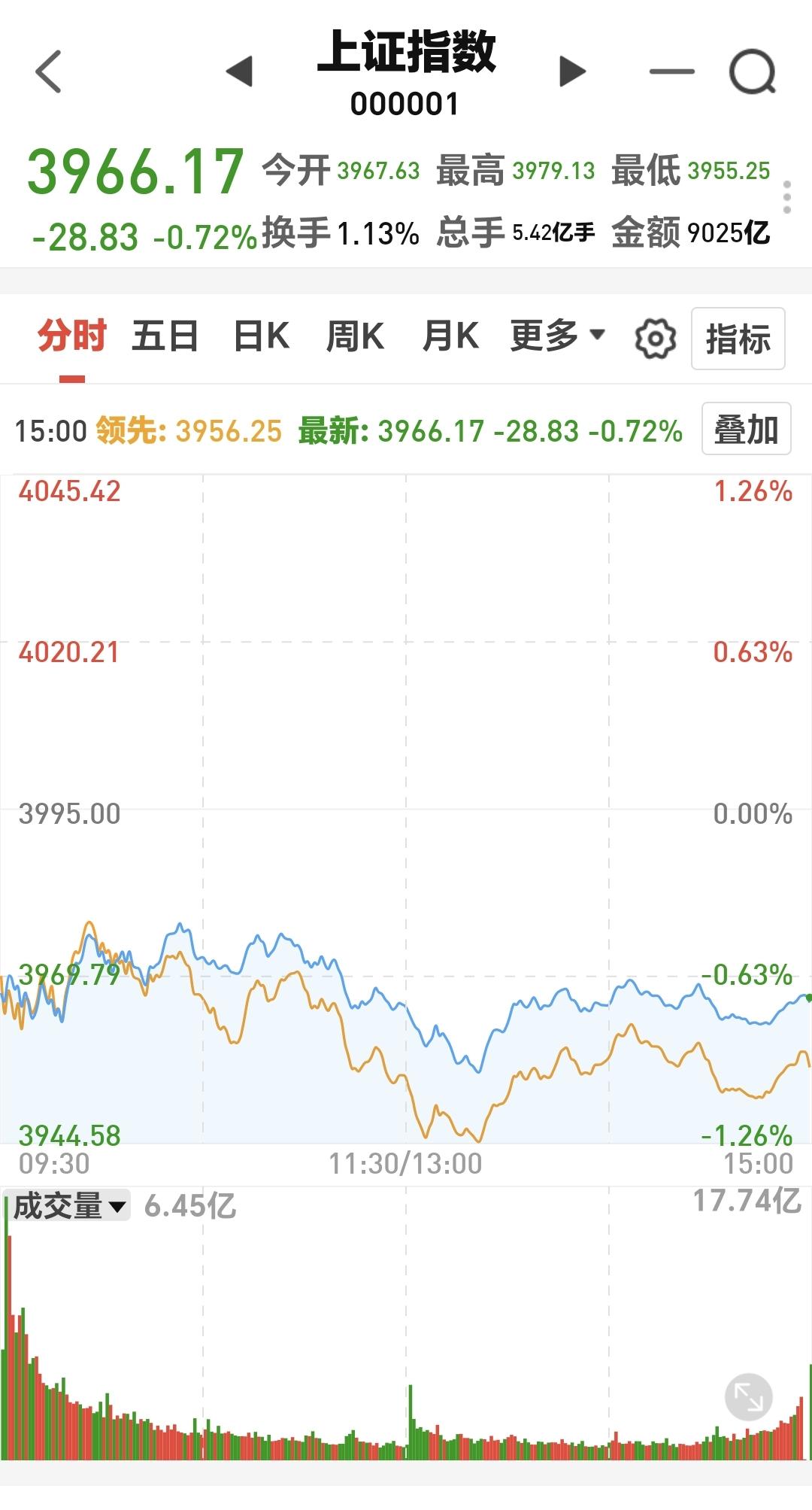 今天市场低开以后小幅度震荡,盘中最高3979点,盘中最低3955点,上下震荡幅度只有24个点,创业板指下跌了0.73%,收于3323点,上证指数下跌了0.72%,收于3966点。