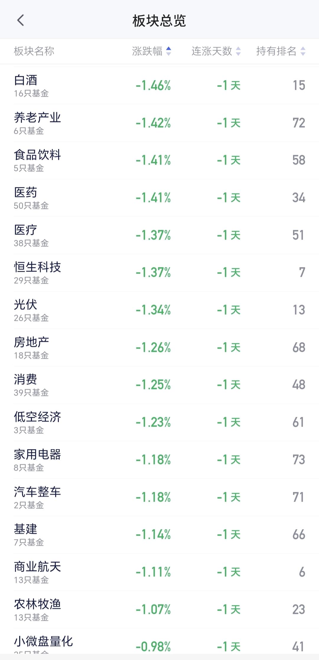 白酒板块今天又是下跌板块,下跌了1.46%,持有人数在所有板块当中排名第15位。