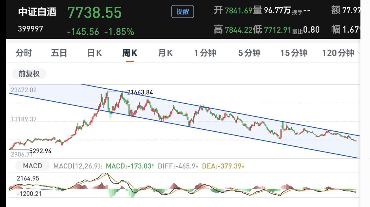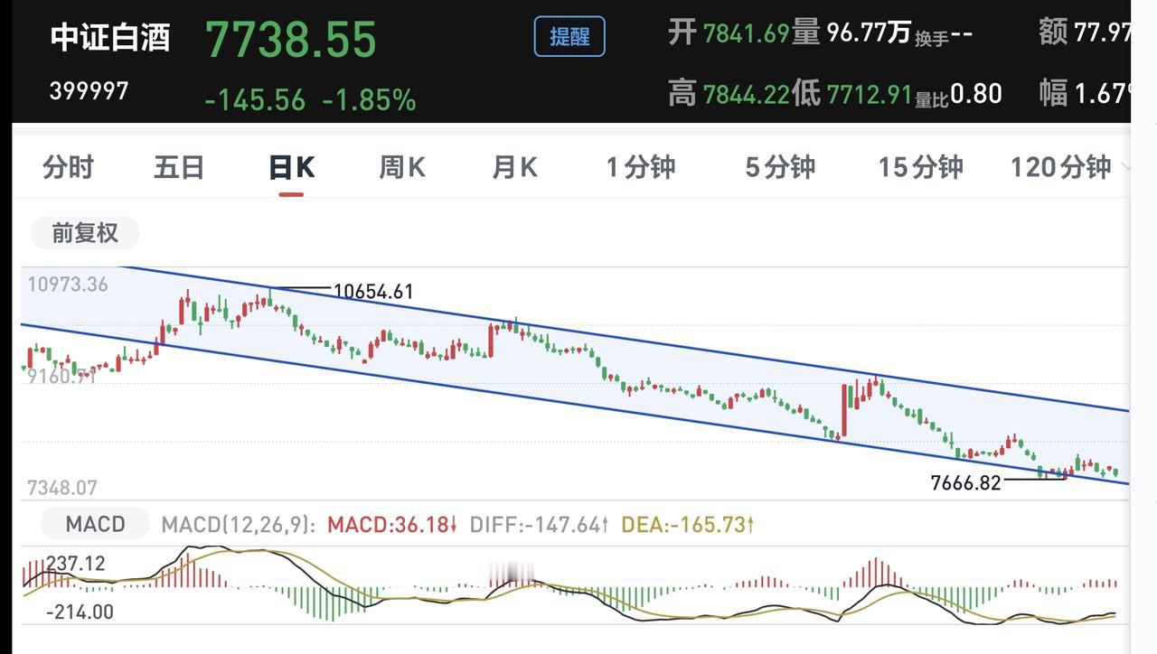 白酒板块日线级别处于下跌通道中,现在的位置距离下跌通道的下轨线更近,这样的位置,如果你不敢进场,但你也不能割肉离场。