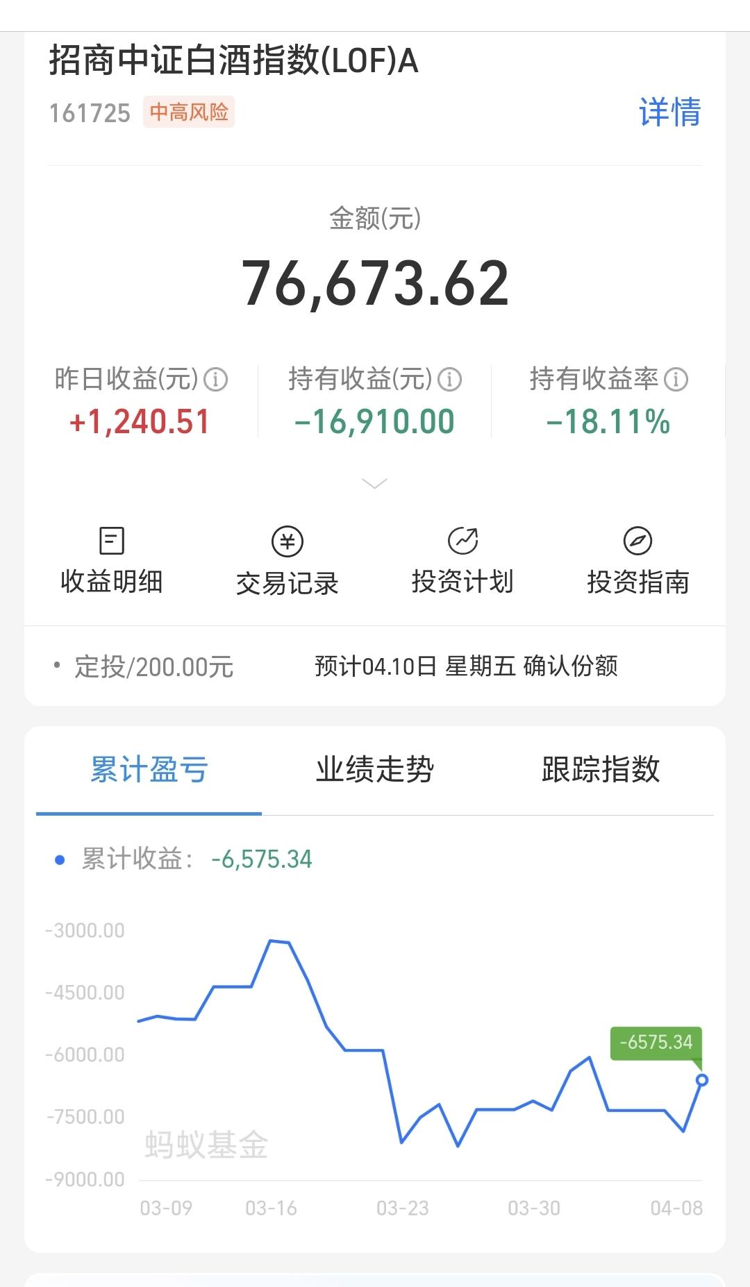 白酒板块基金持有76673元,持有亏损16910元,持有亏损率18.11%,累计亏损6575元。