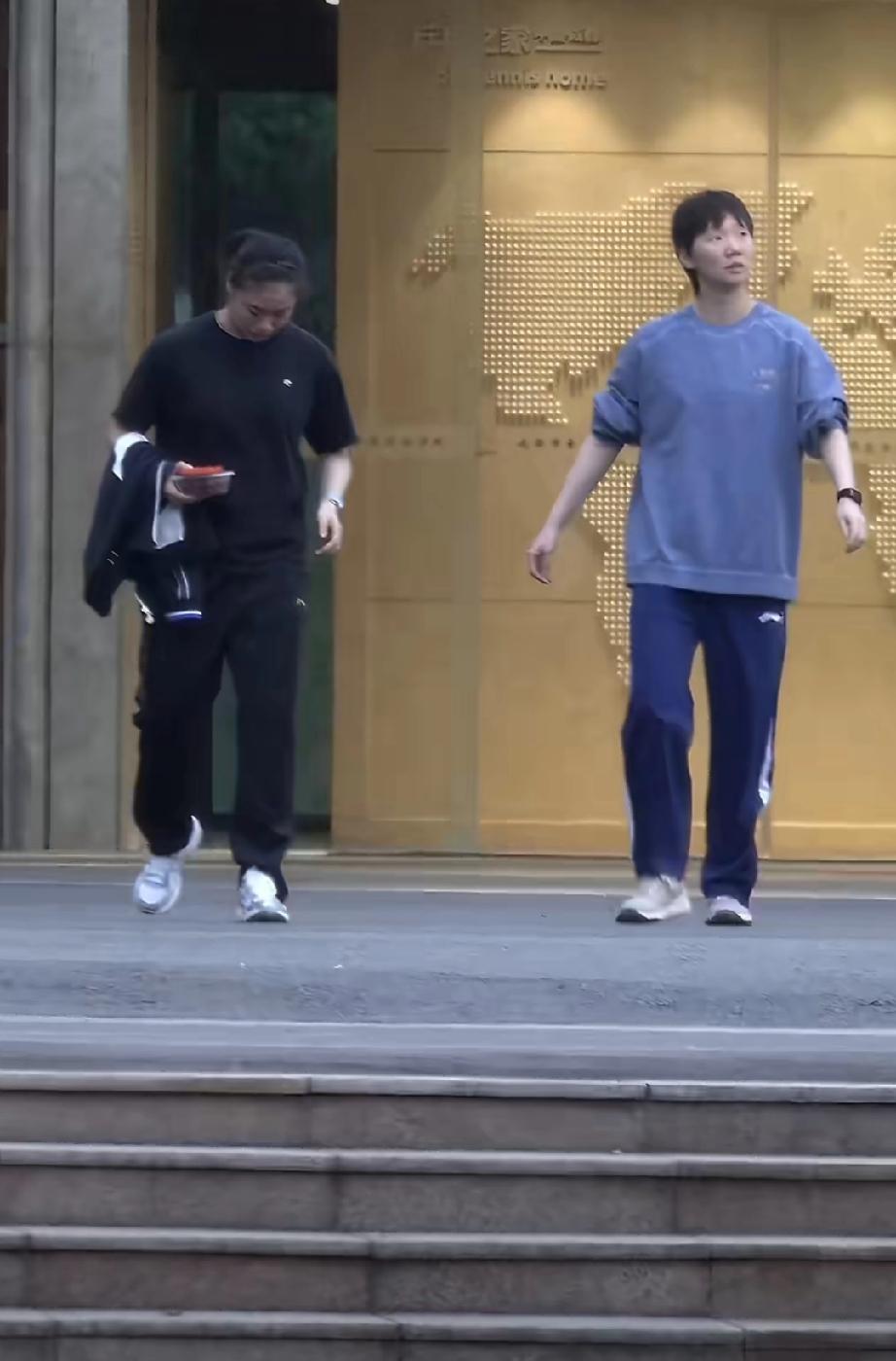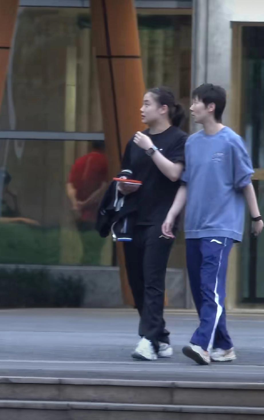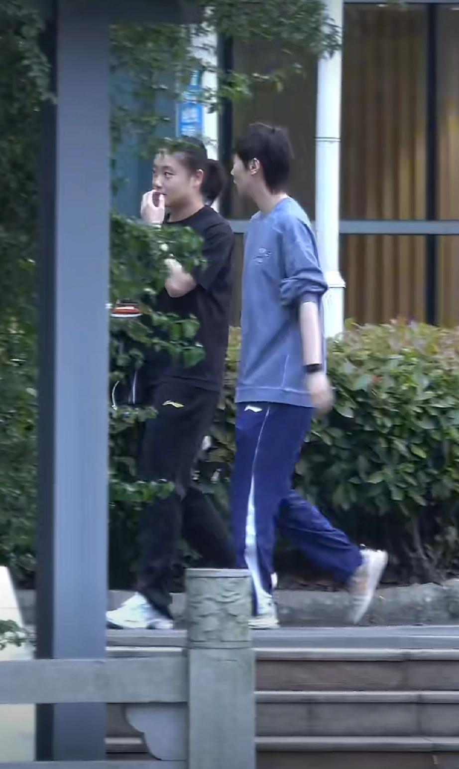 王曼昱今日返回成都国乒训练基地。下午吃完晚饭后,与徐奕一起出门,在院子里溜达消食。