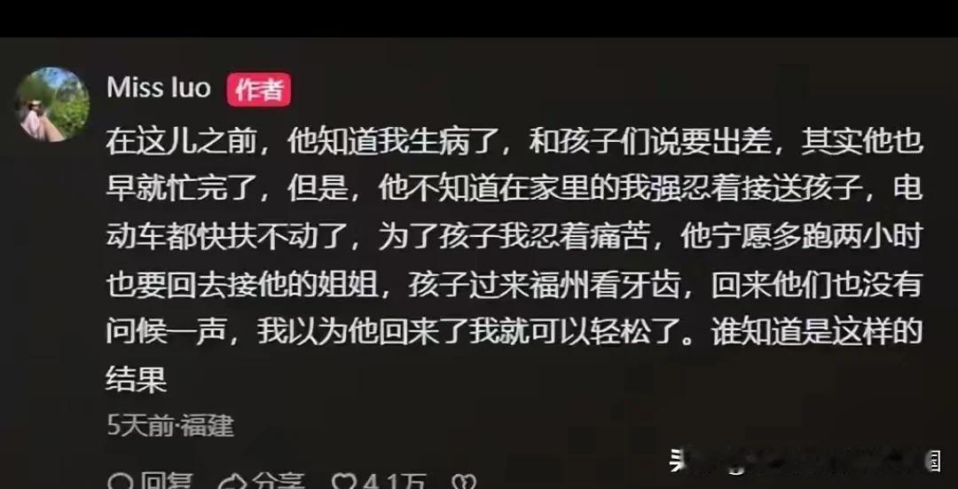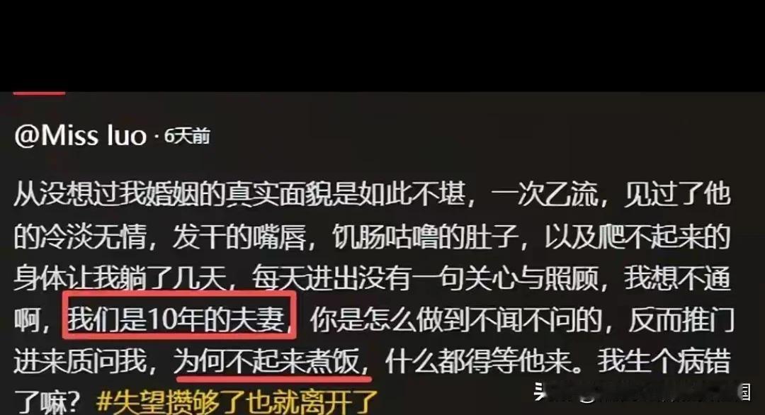 女子高烧40度,在床上躺了三天。丈夫回来了,没有一句关心,只是问:“怎么没做饭?什么都得等我来做?“他站在卧室门口冷冷地看着生病的妻子。现在,女子开始找工作了。