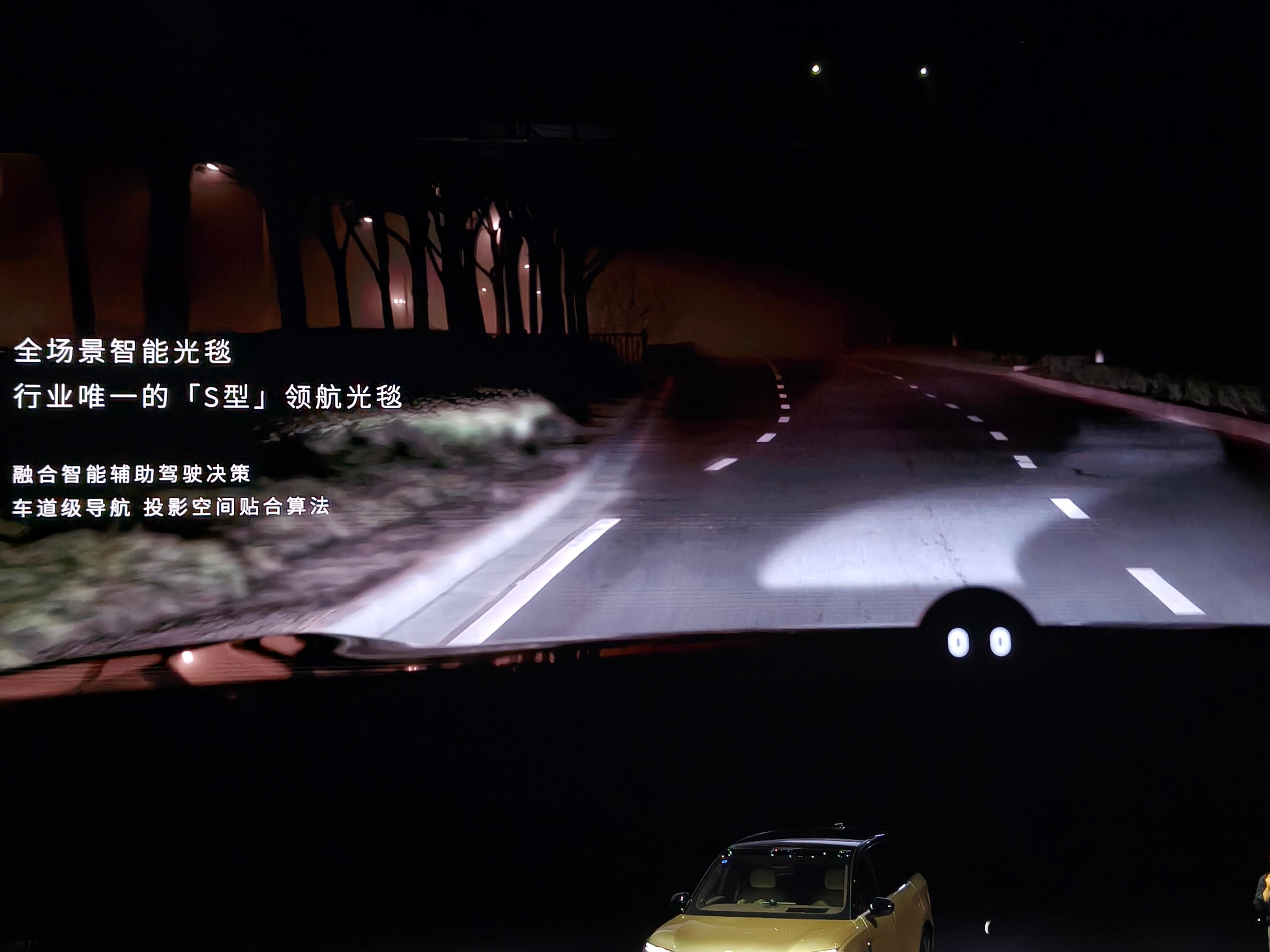 这次首发的超宽广探照光毯宽度达到二十三米,能覆盖 6 个车道,亮度也足够高,再加上能提示变道的 S 型领航光毯,路面信息传递很直观。