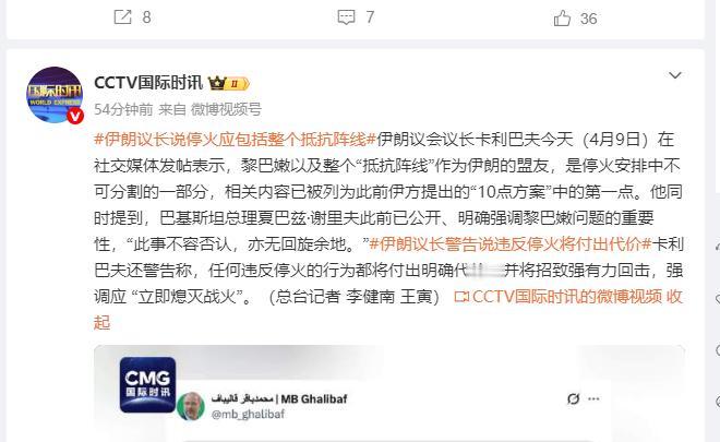 随后,伊朗议长卡利巴夫今天在社交媒体发帖也表示,黎巴嫩以及整个“抵抗阵线”作为伊朗的盟友,是停火安排中不可分割的一部分。意思就是以色列也不能打黎巴嫩,要是打的话,那么停火协议就会失去意义,更加让人意外的是,伊朗议长还警告称,任何违反停火的行为都将付出明确代价,并将招致强有力回击。还有就是伊朗副外长也喊话美国说,必须阻止以色列。不知道经过这个事情之后,以色列还会不会打黎巴嫩,要是再打的话,估计美伊冲突停火也就以失败而结束,美伊冲突还会继续下去,估计以后谈判的机会就不会有了。