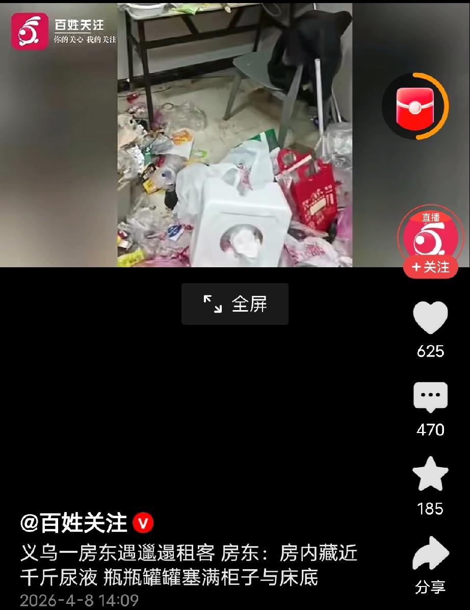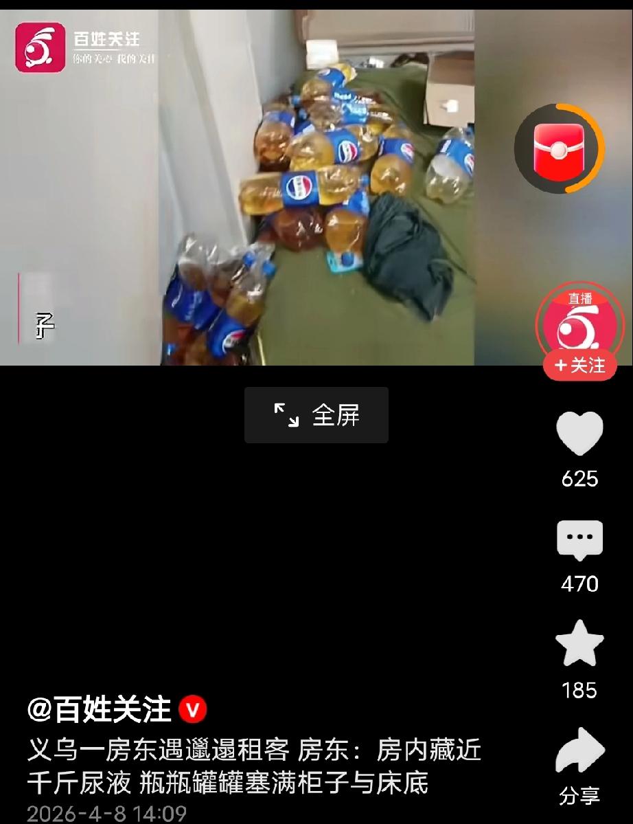 毁三观!浙江义乌,40岁单身男子租了一间房自己住,他太懒了,每次小便,都不去厕所,而是尿到空可乐瓶里,尿满了就直接扔在床边,时间一长,床的四周、衣柜里全部是可乐瓶装的尿液,几百上千瓶,数都数不清,烟头直接扔在床头柜,堆成了一座小山,整个房子看过去就像一个垃圾场,到处黏糊糊的,连落脚的地方都没有,臭气熏天。