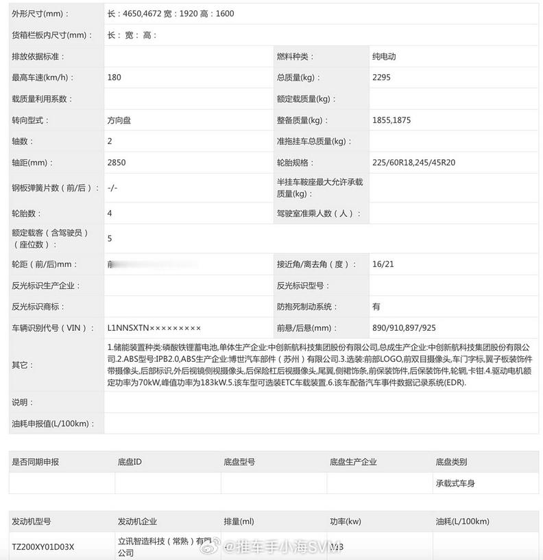看申报图,这款车尺寸比小鹏G6更小,是一款5座SUV,前脸还是与MONA M03一致的家族化设计语言。车身长4650/4672mm、宽1920mm、高1600mm,轴距2850mm;搭载立讯智造电机,峰值功率183kW,电池的中创新航磷酸铁锂电池,这款车应该在今年年内正式发布。