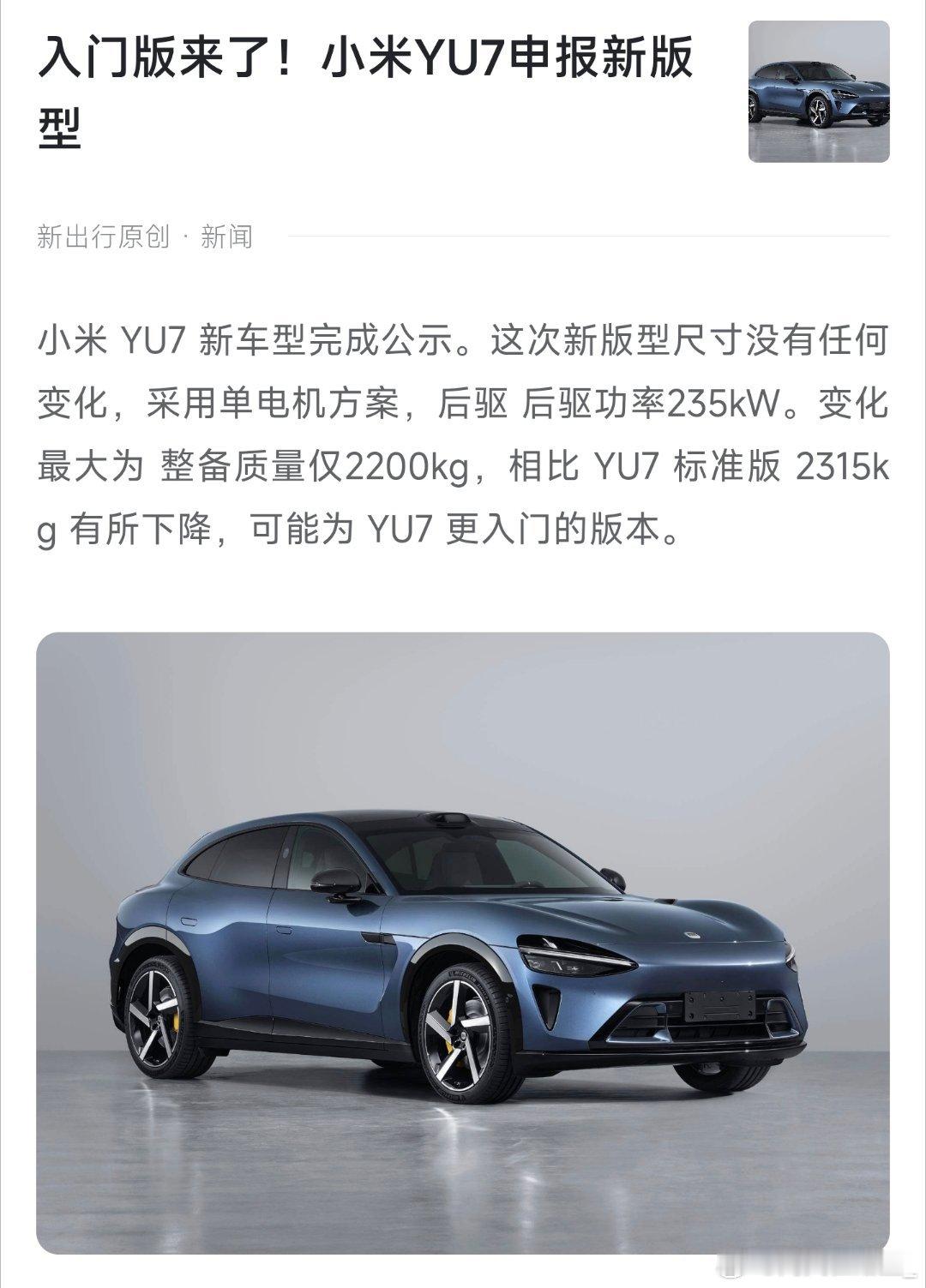 你能想到的对于小米来说肯定也早在盘算之中,所以今天工信部公告里出现了一辆整备质量更轻的小米YU7。YU7新版本质量2650,相比96.3度标准版的2765kg质量差为115kg,这个差值基本能跟20度左右的电池重量完美对上,所以新版本大概率就是比现在的标准版少20度电,那也就对上了新SU7入门标准版的电池sku,实现了该sku的效率最大化。