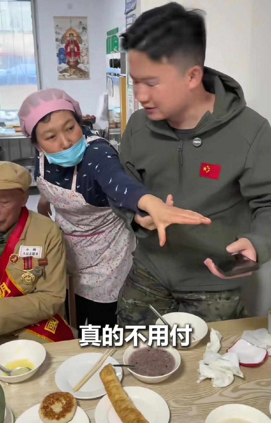 破防了!辽宁丹东,15个人在一家小饭店吃完饭,付钱时。突然,老板娘跟他们说: “这个老人家能来小店吃饭,是小店的荣耀,不用收费的。”他们坚持要付,但老板娘坚决不收。她说: “你要付了,我心里反而不得劲。”最后他们向店家敬礼。